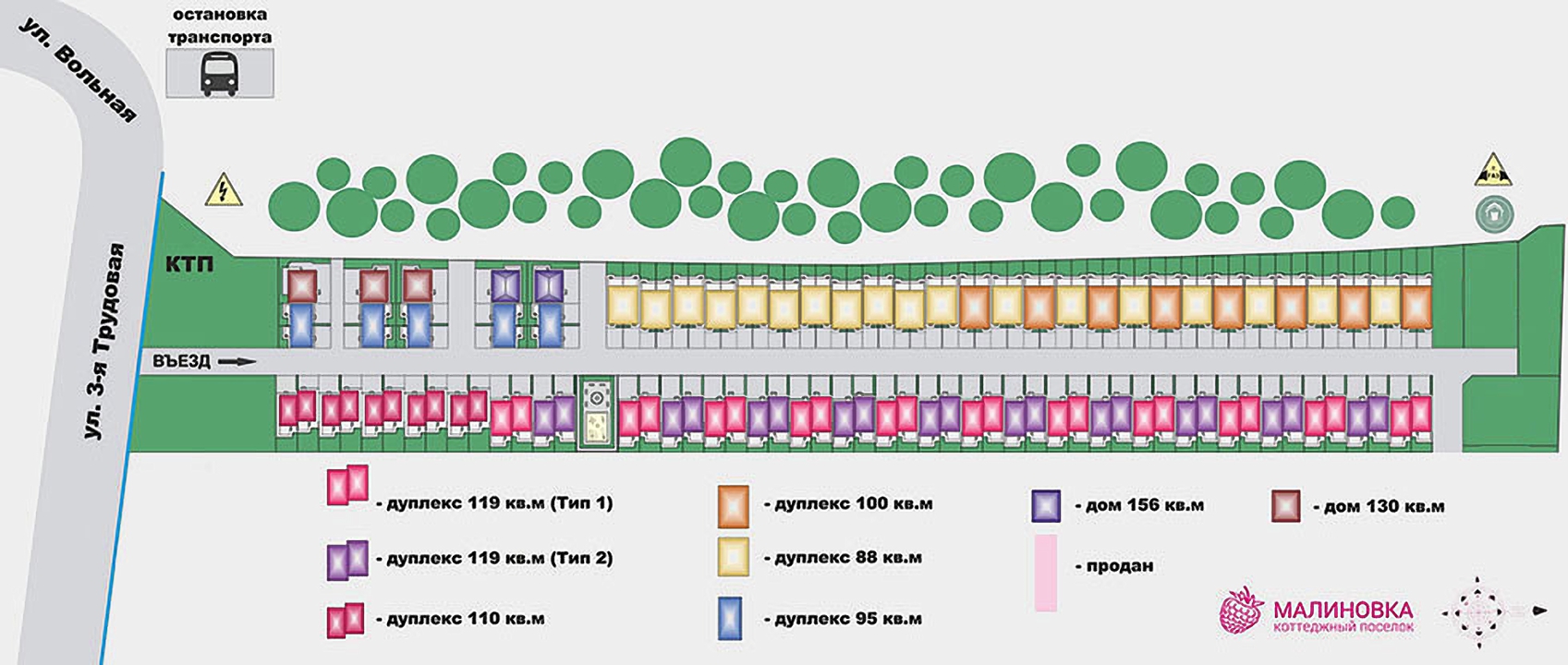 Дома “Малиновки” выдержаны в едином архитектурном стиле, и похожи на уютный пригород крупных европейских городов — аккуратные двухэтажные домики с балконами и террасами, рядом с каждым расположен небольшой облагороженный участок с клумбами и декоративными кустарниками. Обязательное условие — на каждом участке будет куст малины, который высадят для жильцов работники фирмы-застройщика. Такой приятный подарок на новоселье.