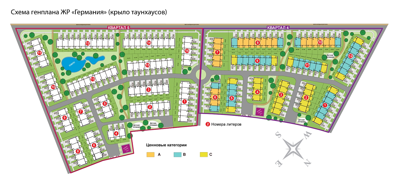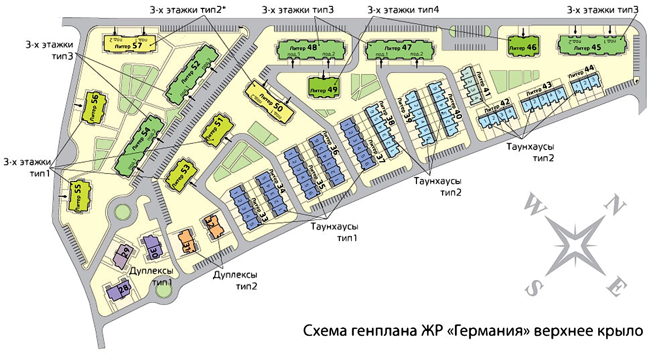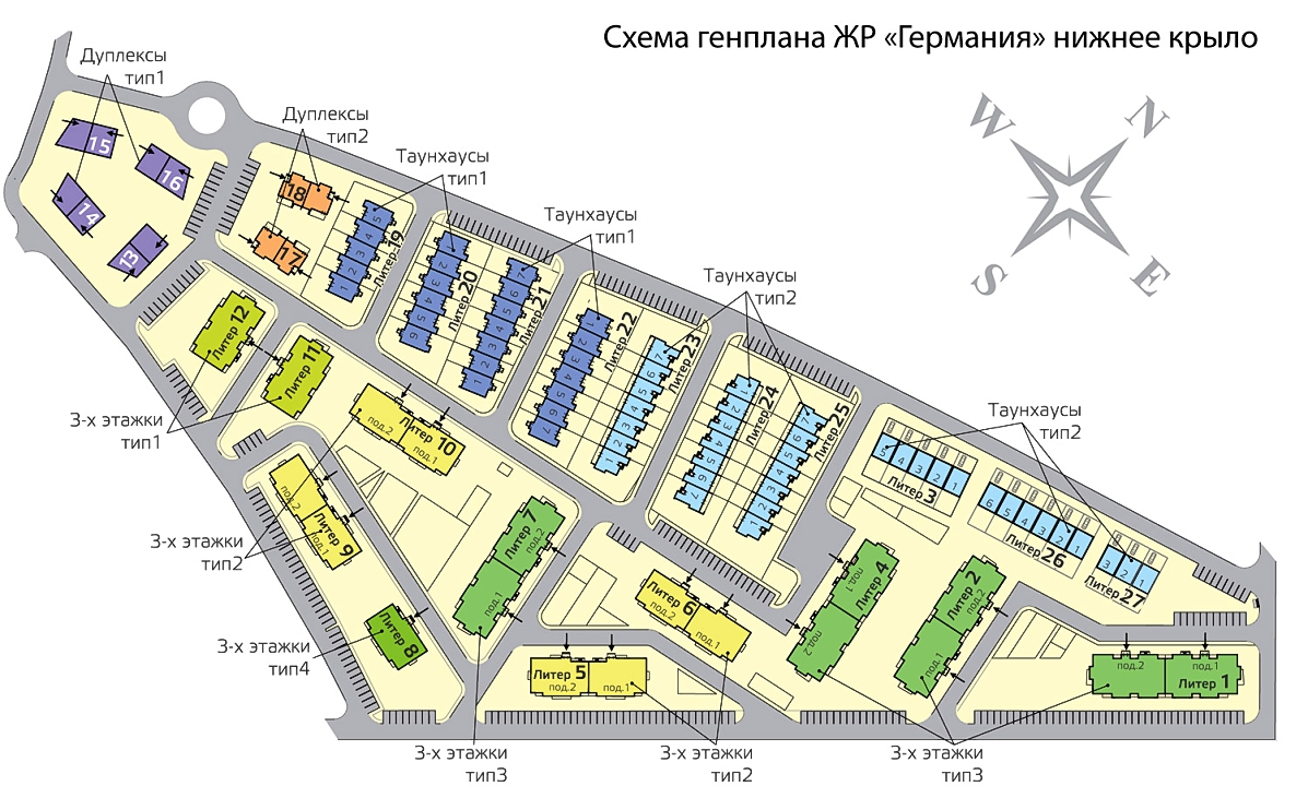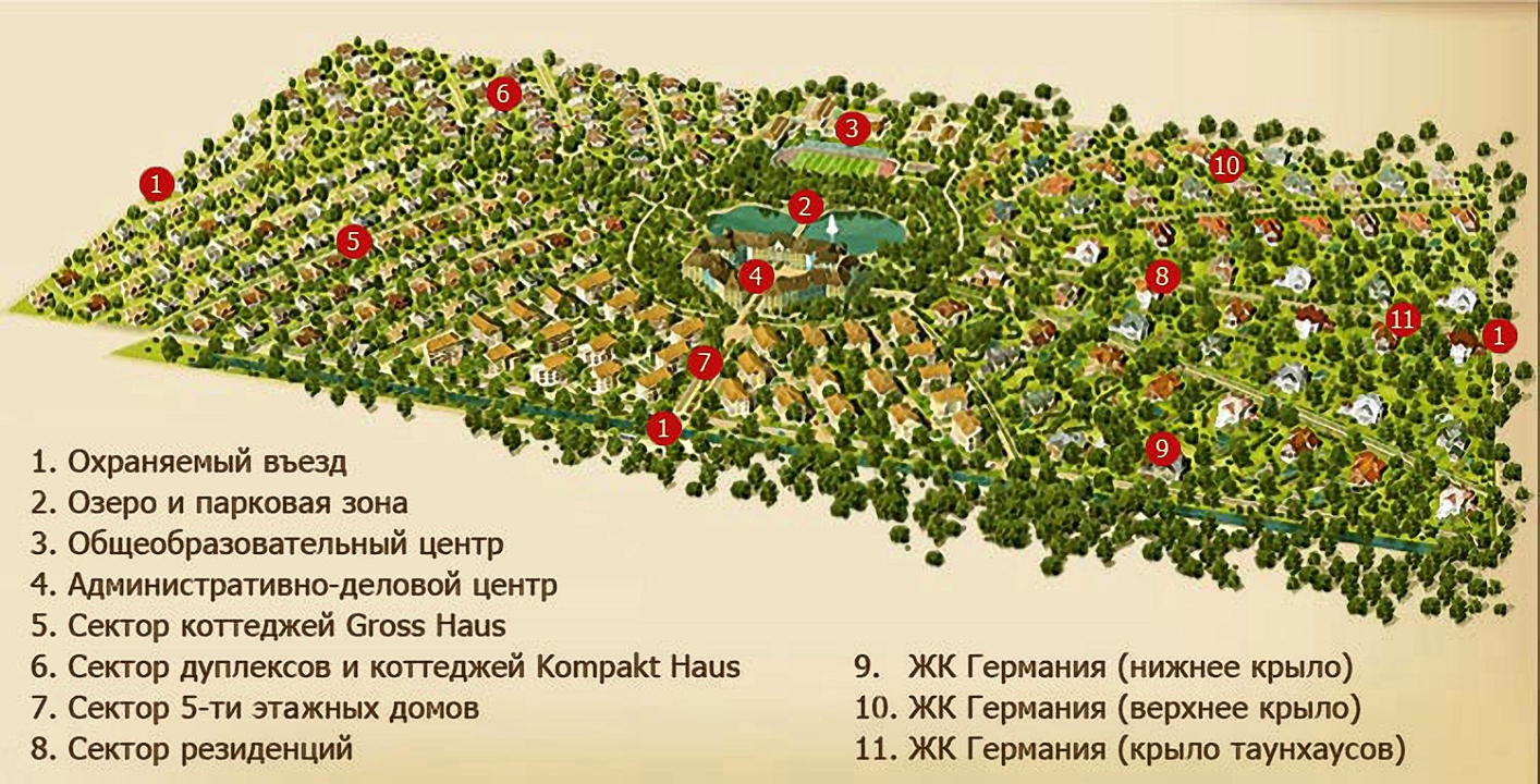 • двухэтажные коттеджи и трехэтажные многоквартирные дома ЖК "Германия" входят в комплексную застройку "Немецкой деревни".