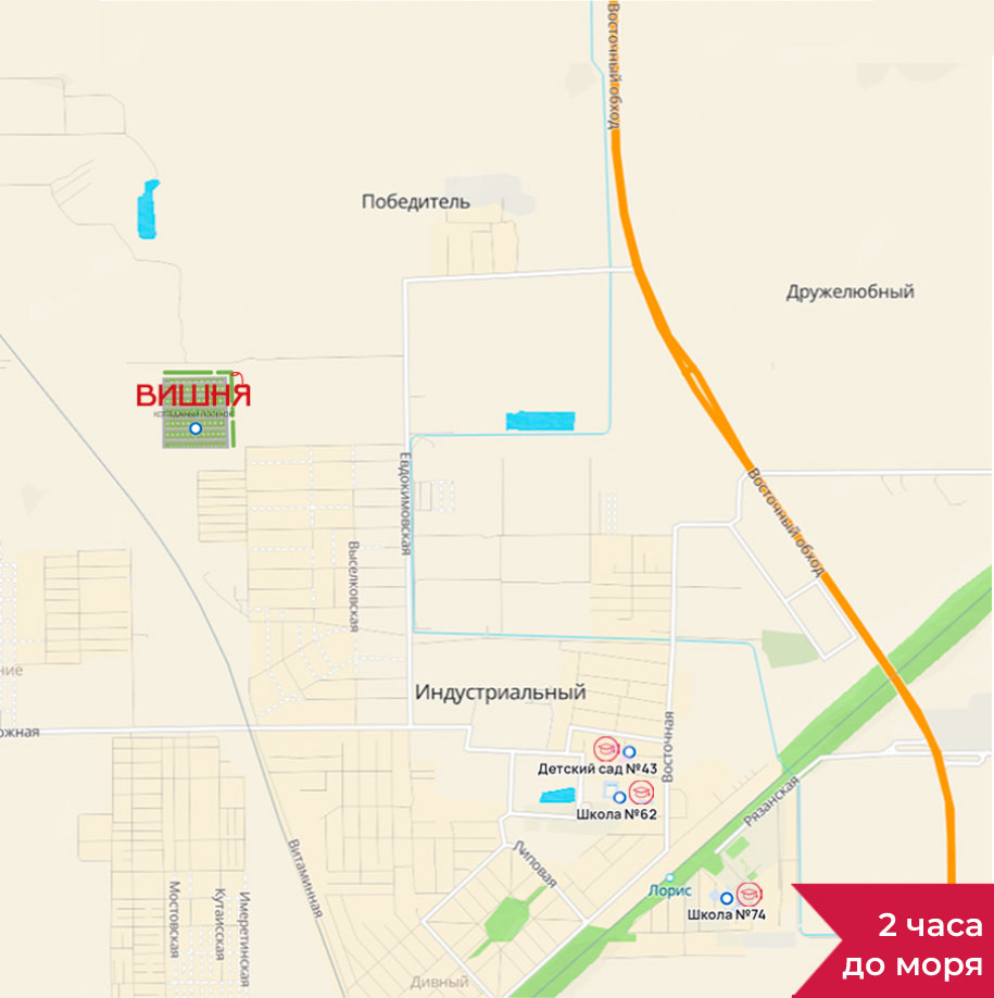 КП «Вишня» расположен на самой границе между посёлком Индустриальный и г. Краснодаром, поэтому жители получают городскую прописку. Организован удобный съезд на Багратионовскую улицу, через которую можно добраться на Дорожную улицу, а после – на Восточный обход, признанный крупнейшей транспортной артерией города и края в целом. Благодаря такому расположению удобно добраться до любого района Краснодара.