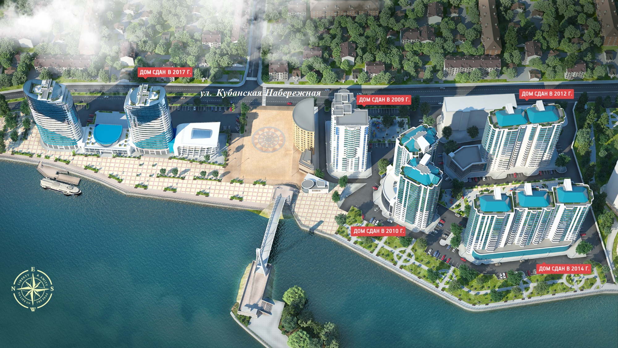Комплекс возведен компанией "Kuban Ship", основанной в 1858 году. Организация специализируется на транспортных услугах, но и строительство недвижимости входит в сферу ее интересов. "Kuban Ship" обладает хорошими производственными мощностями, зарекомендовала себя как надёжный застройщик, сдающий объекты в срок.