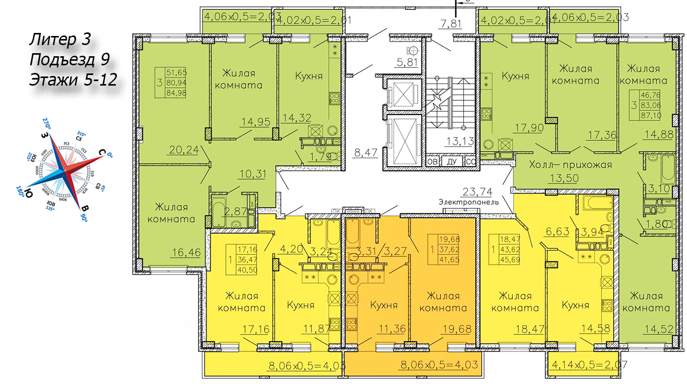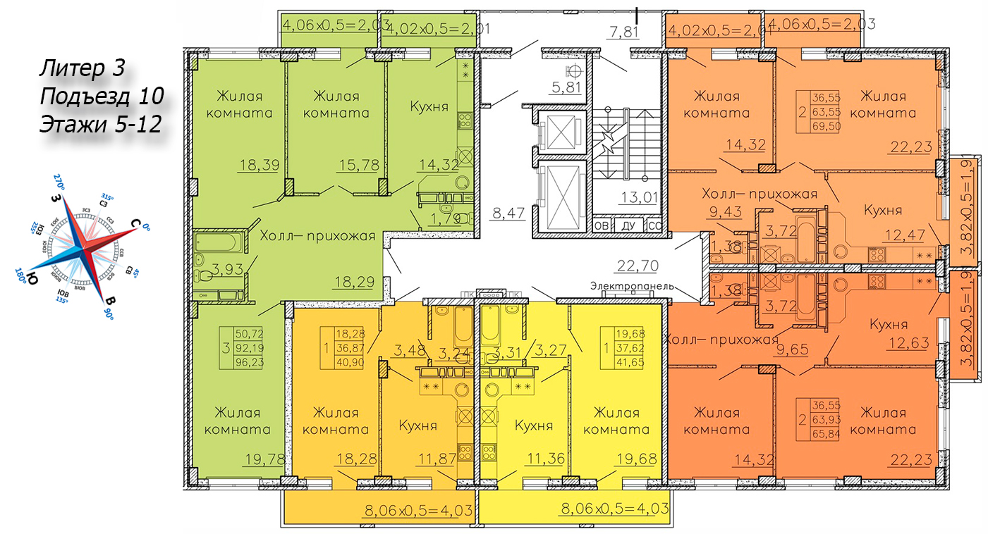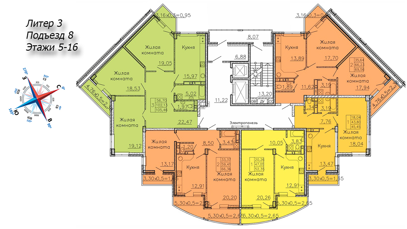 К продаже предлагаются 1-, 2-, 3-комнатные квартиры с лоджиями, общей площадью от 38,3 до 105,1 кв.м. Преобладают “однушки”. Квартиры сданы с предчистовой отделкой, включающей: стяжку полов, оштукатуривание стен, подключение и разводку коммуникаций, установку двойных стеклопакетов, счетчиков учета потребления воды и электроэнергии, радиаторов отопления, входной металлической двери.
