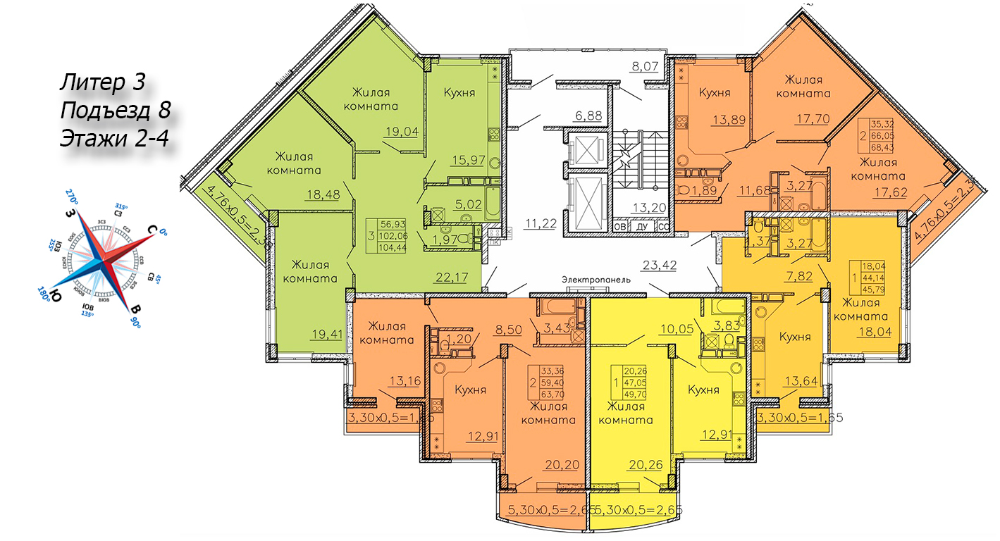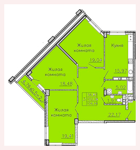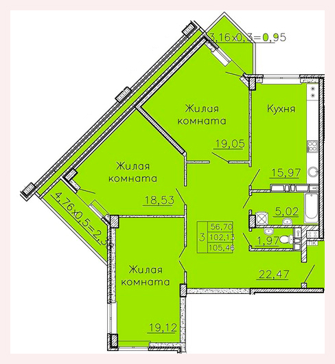 | 3 | 105.46 / 56.93 м² | от 10 018 700 руб. (95 000 руб./м²) | Планировка |
