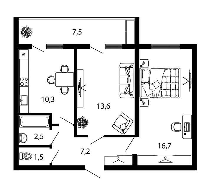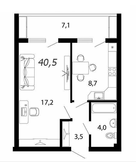 | 1 | 40.5 / 17.2 м² | от 4 250 000 руб. (104 938 руб./м²) | Планировка | |