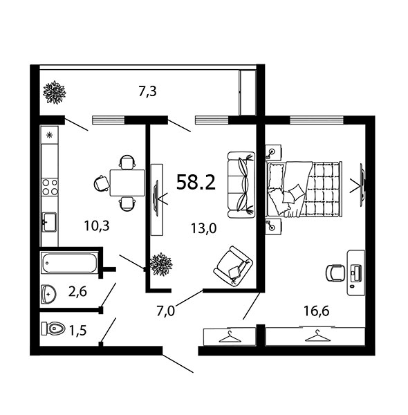 | 2 | 58.2 / 29.6 м² | от 5 800 000 руб. (99 656 руб./м²) | Планировка | |