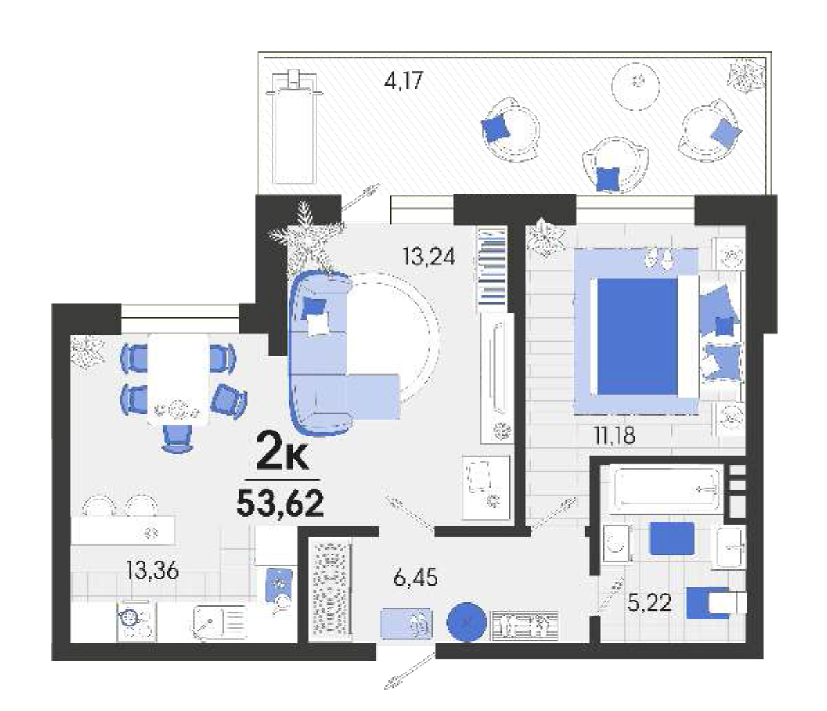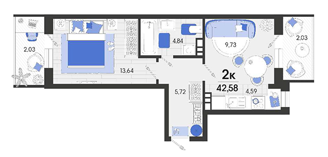 | 1 | 42.58 / 13.64 м² | от 6 897 960 руб. (162 000 руб./м²) | Планировка | |