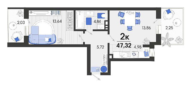 | 1 | 47.32 / 13.64 м² | от 6 956 040 руб. (147 000 руб./м²) | Планировка | |