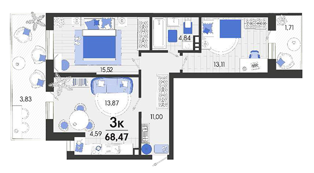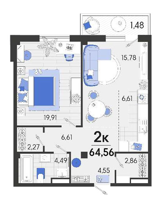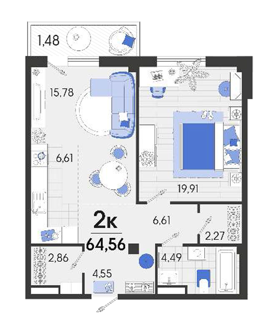 | 1 | 64.56 / 19.91 м² | от 8 457 360 руб. (131 000 руб./м²) | Планировка | |