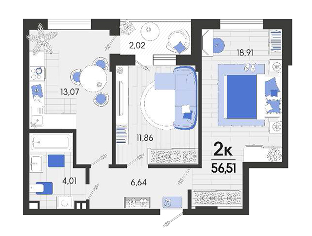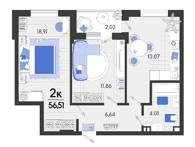 | 2 | 56.51 / 30.77 м² | от 6 837 710 руб. (121 000 руб./м²) | Планировка | |