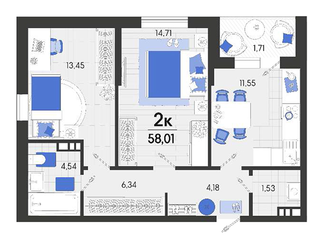 | 2 | 58.01 / 28.16 м² | от 7 947 370 руб. (137 000 руб./м²) | Планировка |