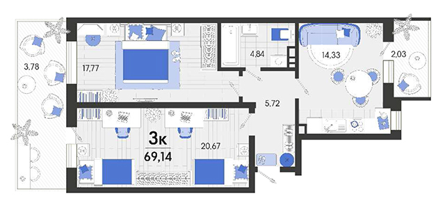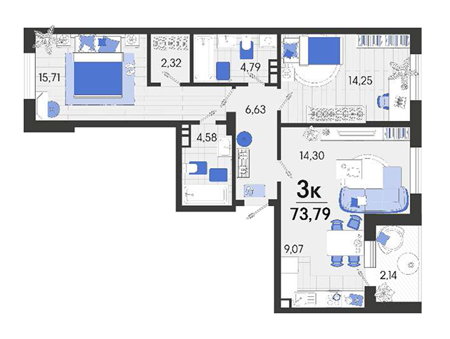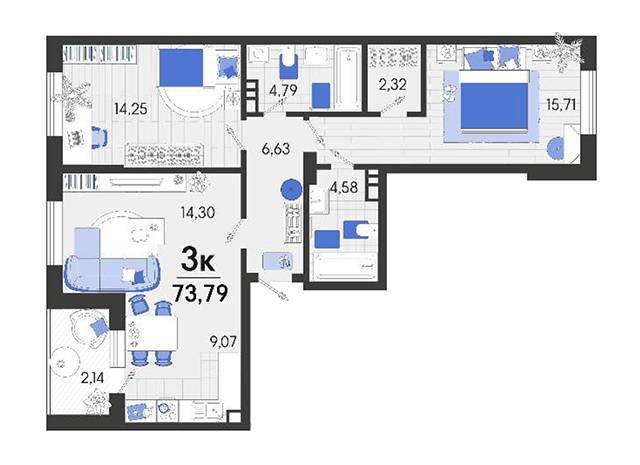 | 2 | 73.79 / 29.96 м² | от 8 928 590 руб. (121 000 руб./м²) | Планировка | |