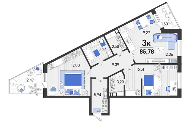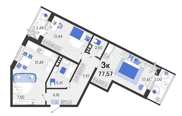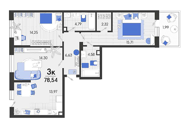 | 2 | 78.54 / 29.96 м² | от 9 189 180 руб. (117 000 руб./м²) | Планировка | |