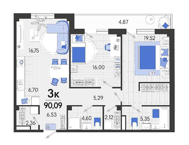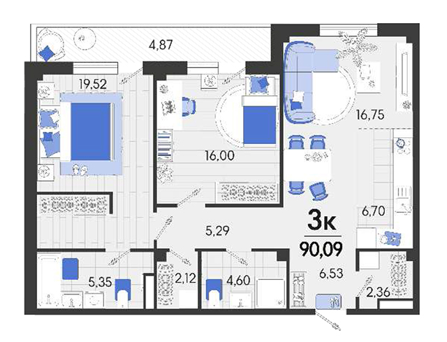 | 2 | 90.09 / 35.52 м² | от 11 531 520 руб. (128 000 руб./м²) | Планировка | |