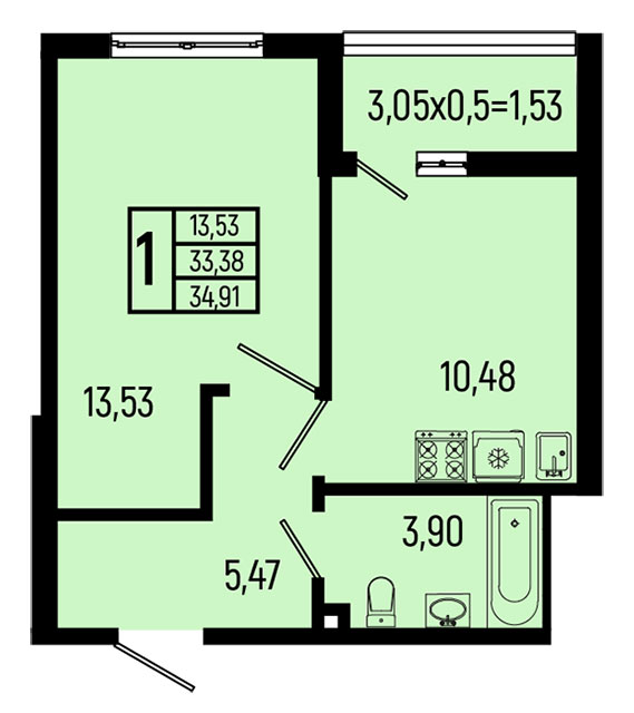| 1 | 34.91 / 13.53 м² | от 9 251 150 руб. (265 000 руб./м²) | Планировка | |