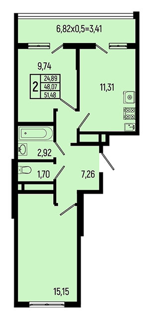 | 2 | 51.48 / 24.89 м² | от 13 384 800 руб. (260 000 руб./м²) | Планировка |