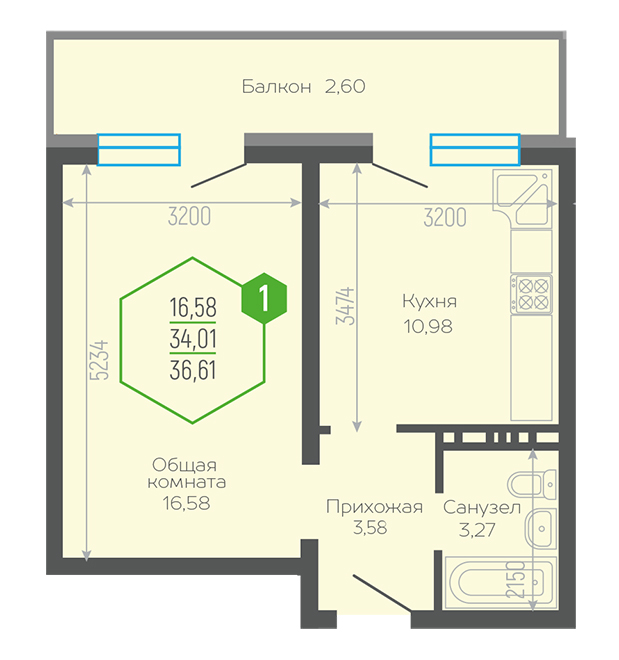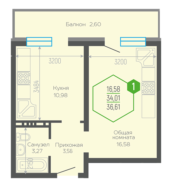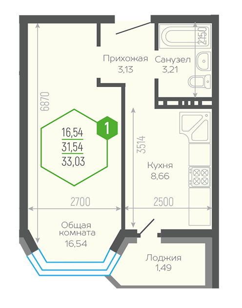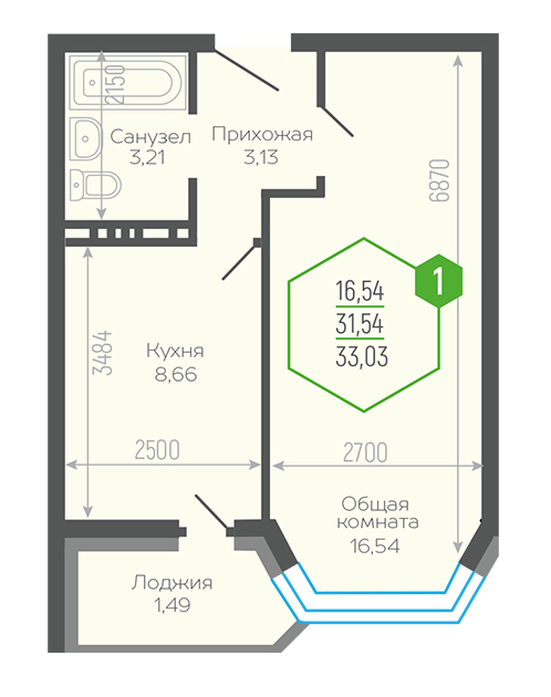 | 1 | 32.52 / 16.54 м² | от 4 390 200 руб. (135 000 руб./м²) | Планировка | |