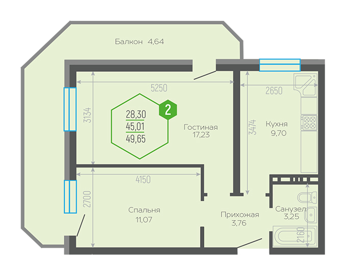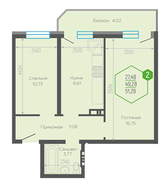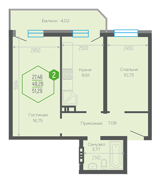 | 2 | 49.75 / 28.3 м² | от 6 467 500 руб. (130 000 руб./м²) | Планировка | |