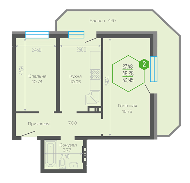 | 2 | 53.92 / 27.48 м² | от 6 470 400 руб. (120 000 руб./м²) | Планировка | |