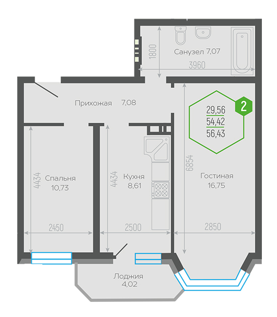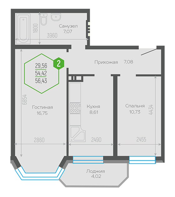 | 2 | 55.91 / 29.56 м² | от 6 150 100 руб. (110 000 руб./м²) | Планировка | |