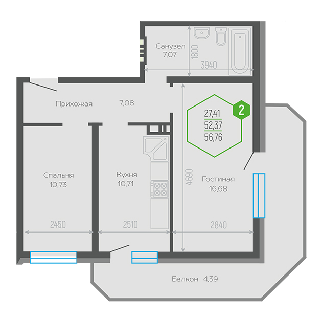 | 2 | 56.87 / 27.41 м² | от 6 170 395 руб. (108 500 руб./м²) | Планировка |