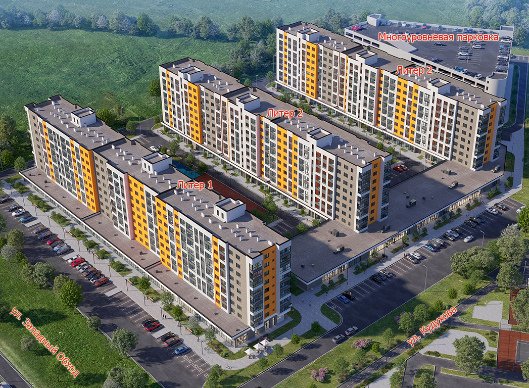 По периметру с внешней стороны будет обрамляться коммерческими помещениями, вход во двор только для жильцов и без машин. Соответственно дворы безопасные, с детскими и спортивными площадками. Западный обход находится сразу же недалеко от комплекса. Ддля того чтобы перейти на огромную территорию, которая сейчас застраивается ЖК “Самолет” можно воспользоваться удобным воздушным переходом.