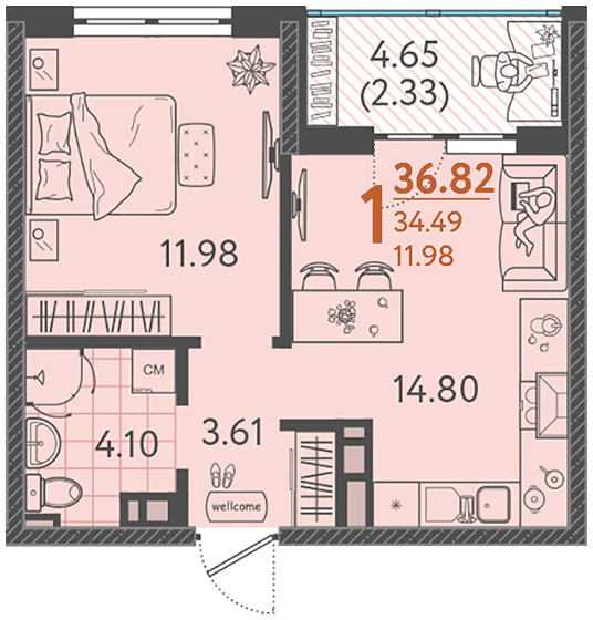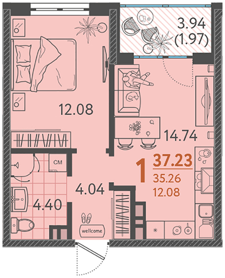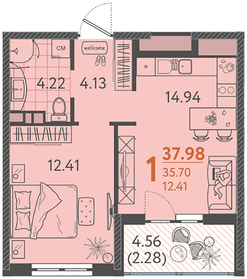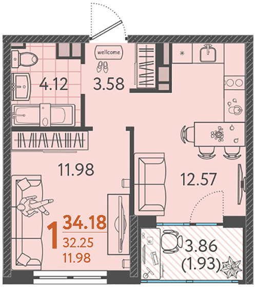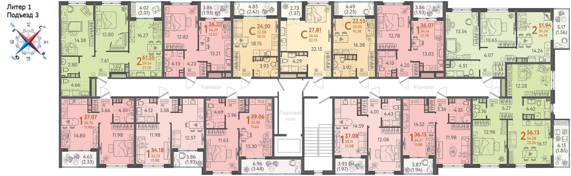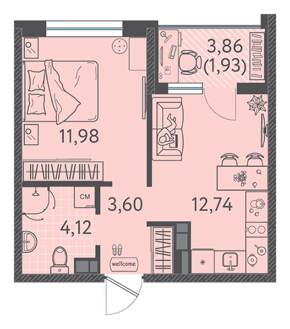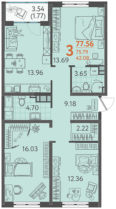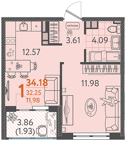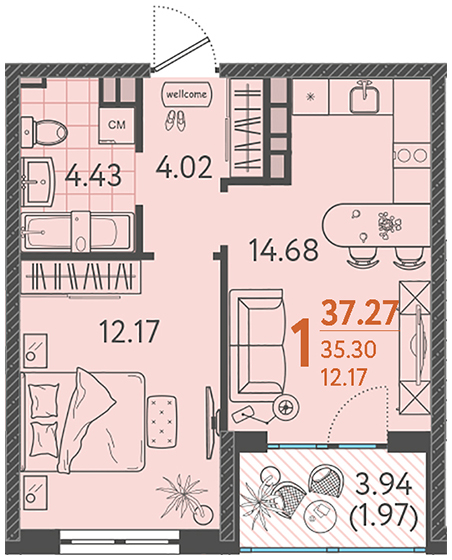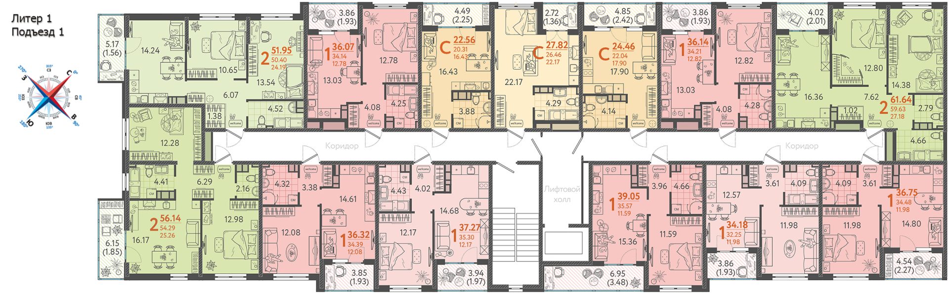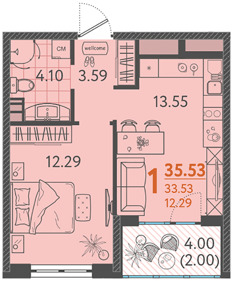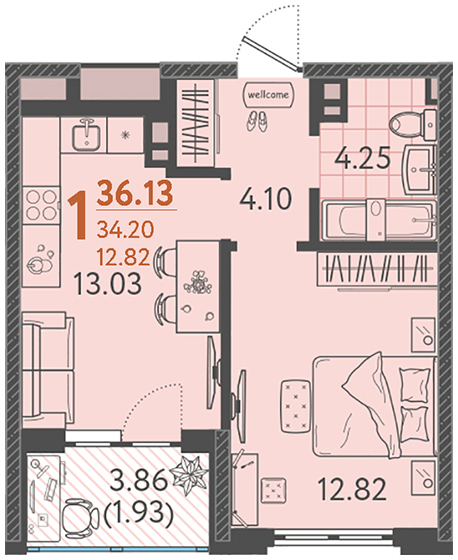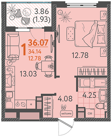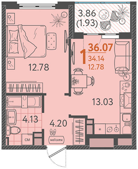 1 36.07 / 12.78 м² от 6 059 760 руб. (168 000 руб./м²) Планировка