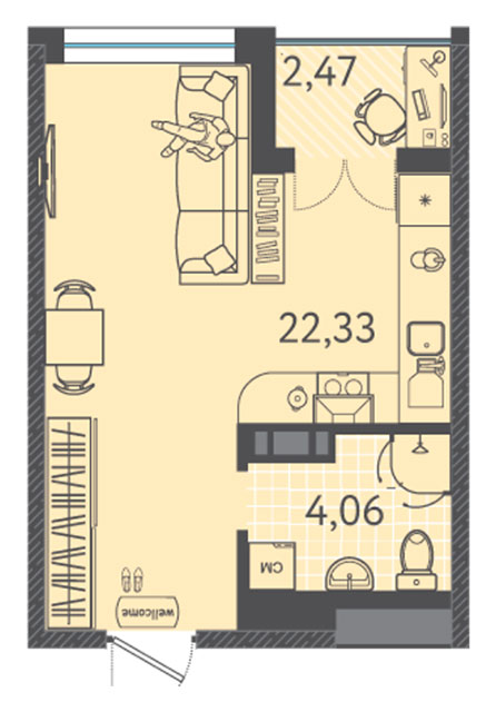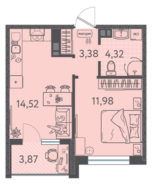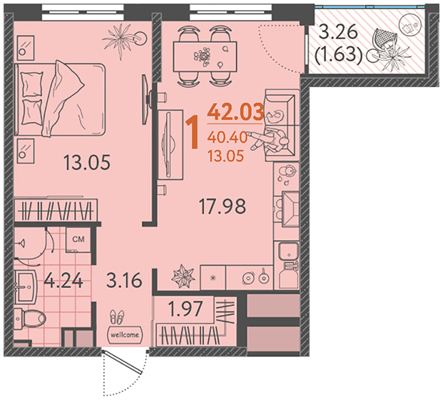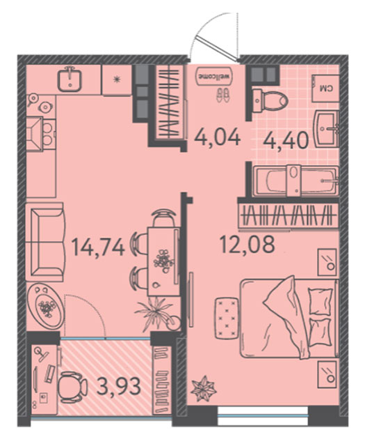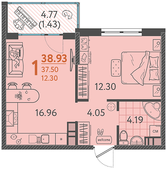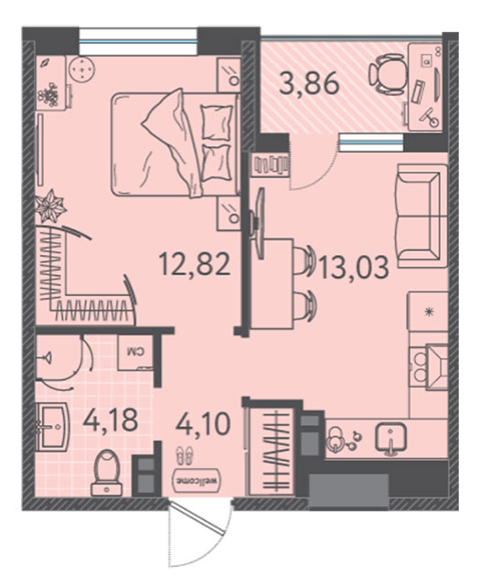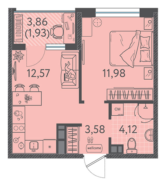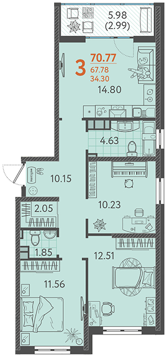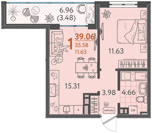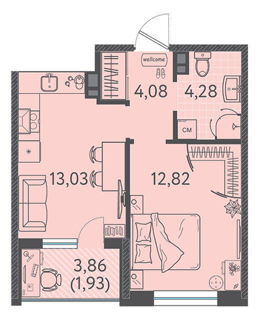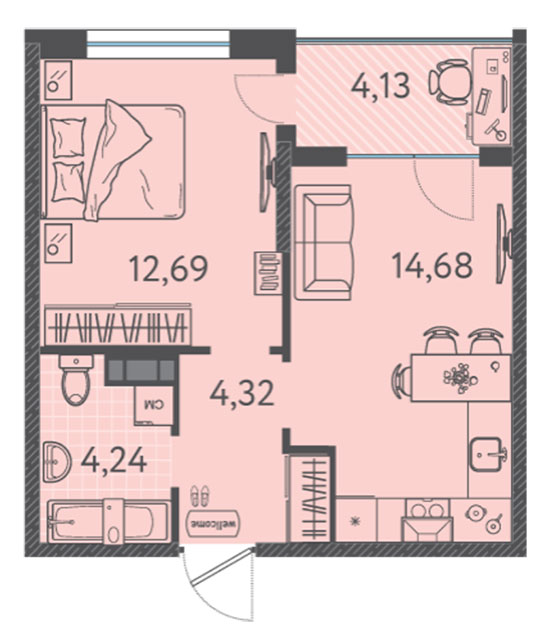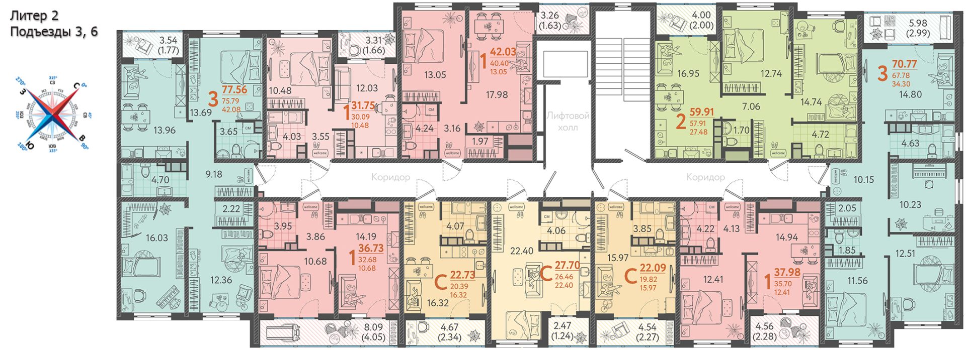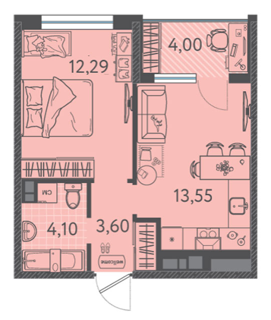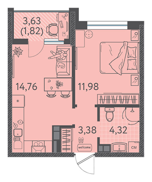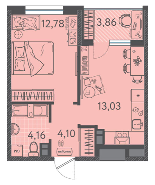 1 36.07 / 12.78 м² от 6 059 760 руб. (168 000 руб./м²) Планировка
