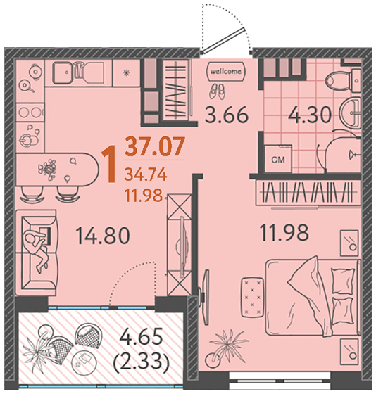 1 37.27 / 11.98 м² от 5 814 120 руб. (156 000 руб./м²) Планировка