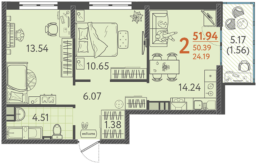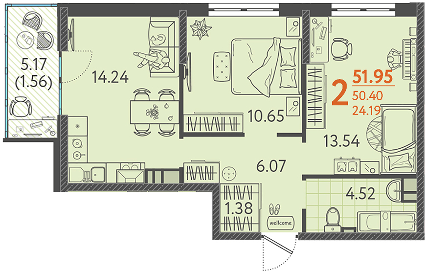 2 51.95 / 24.19 м² от 6 961 300 руб. (134 000 руб./м²) Планировка