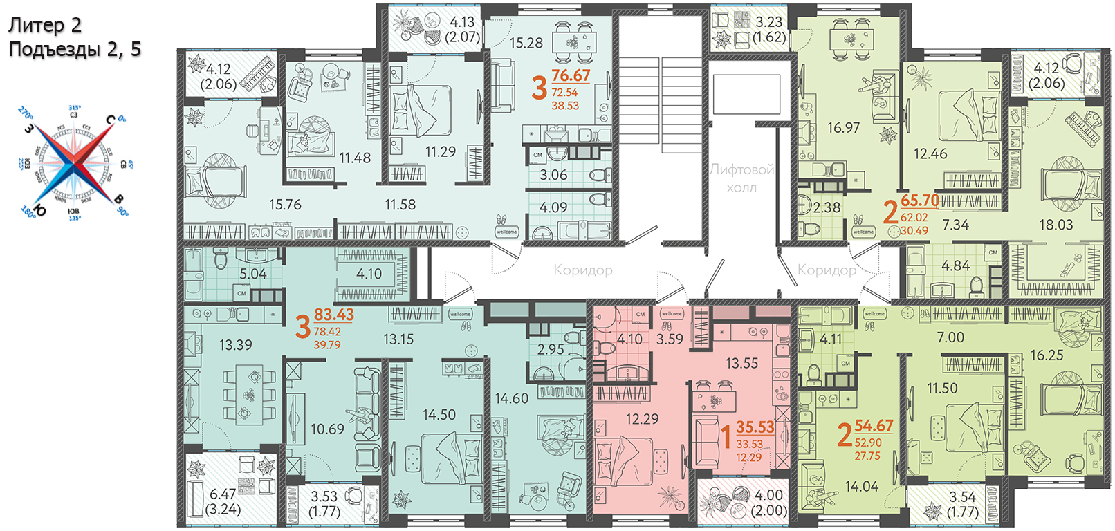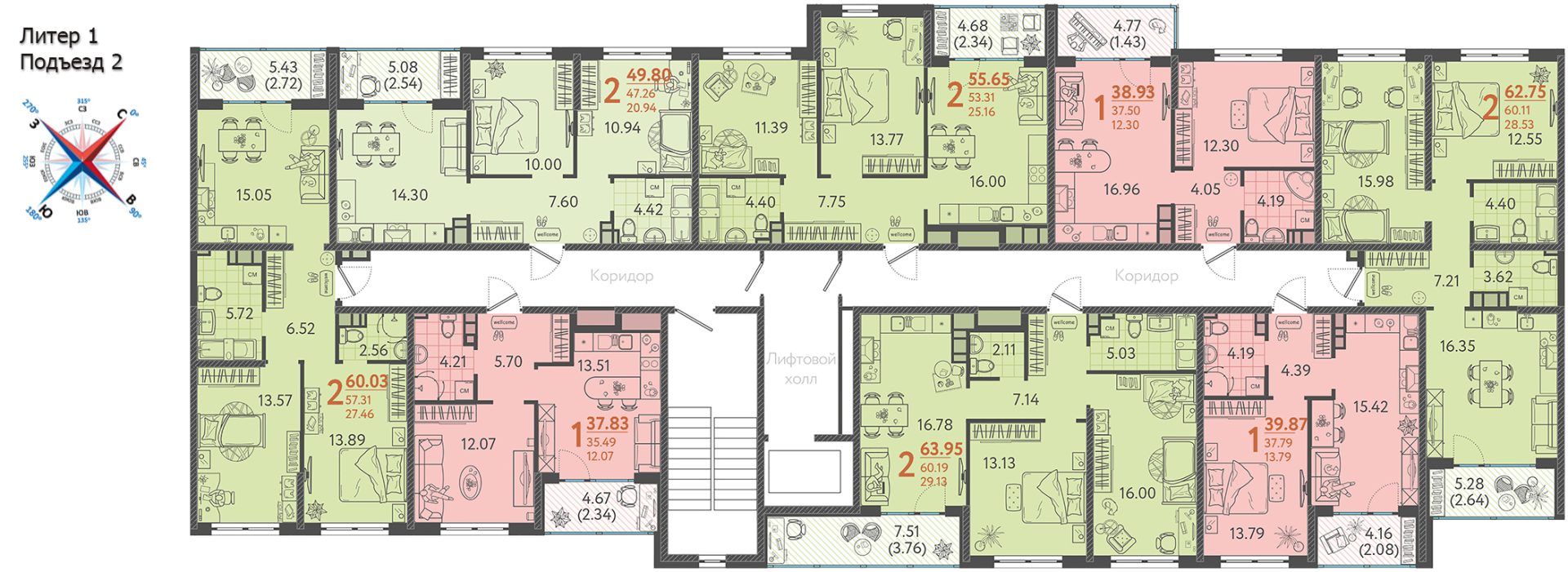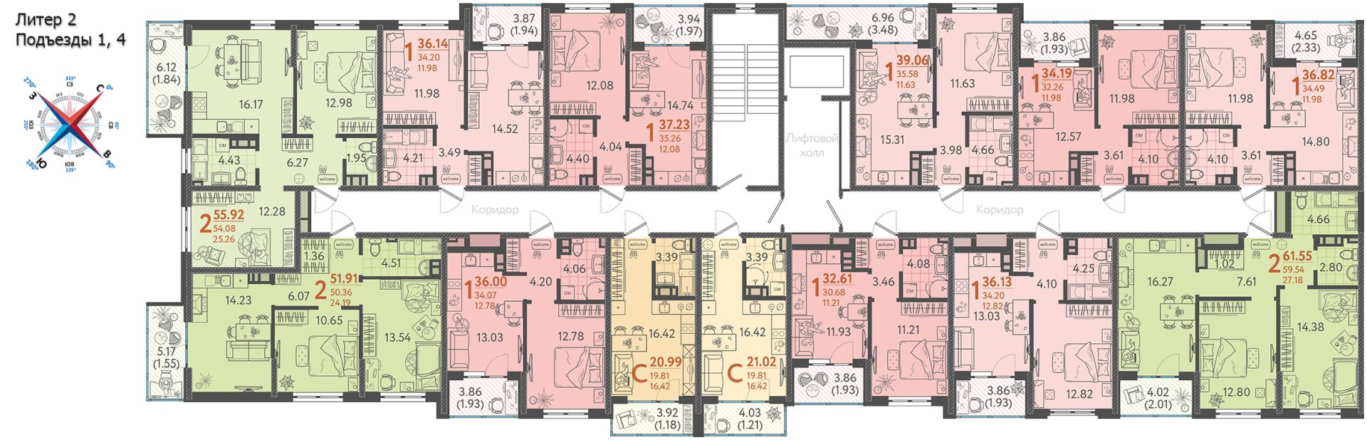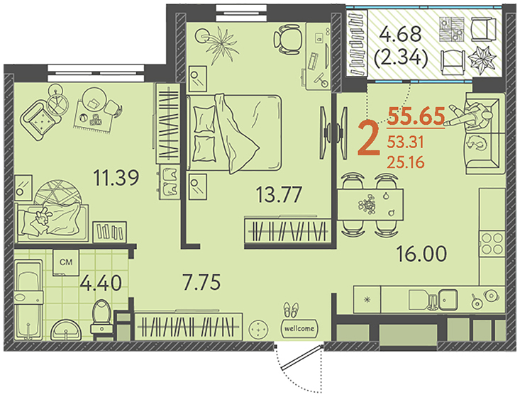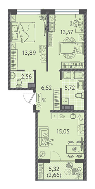 2 55.65 / 25.16 м² от 7 401 450 руб. (133 000 руб./м²) Планировка