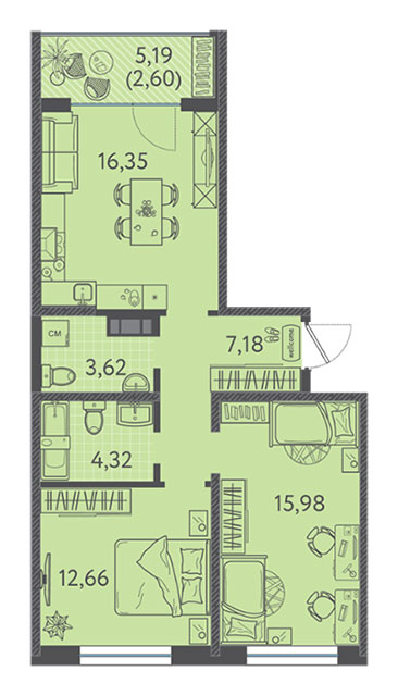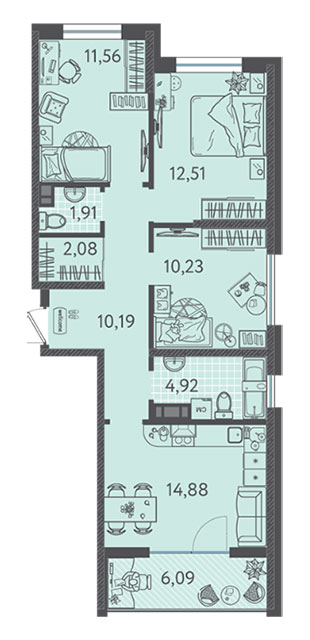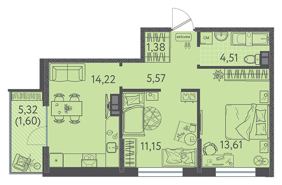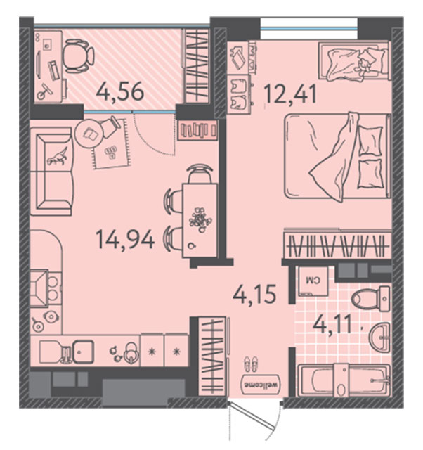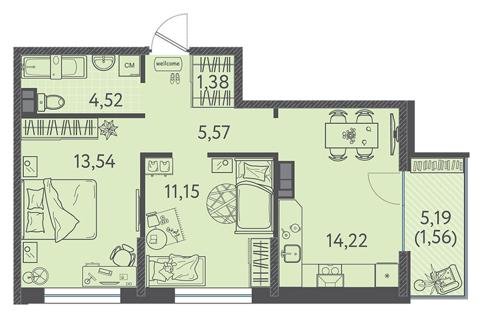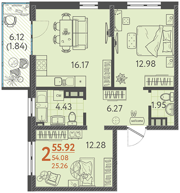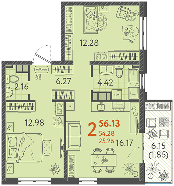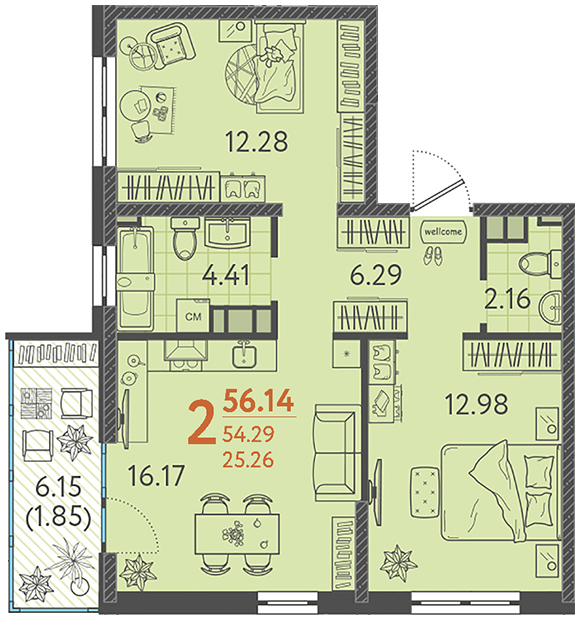 2 56.14 / 25.26 м² от 7 410 480 руб. (132 000 руб./м²) Планировка