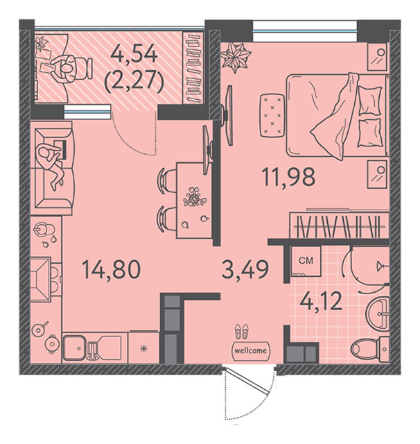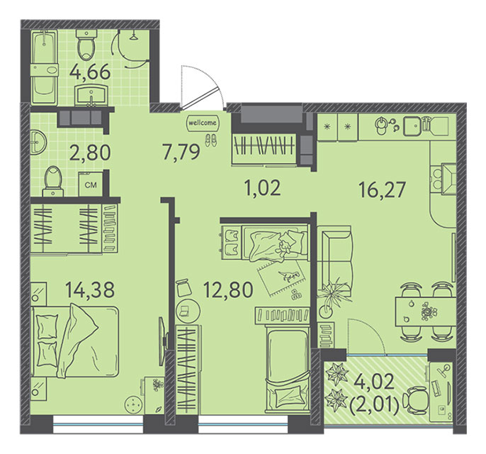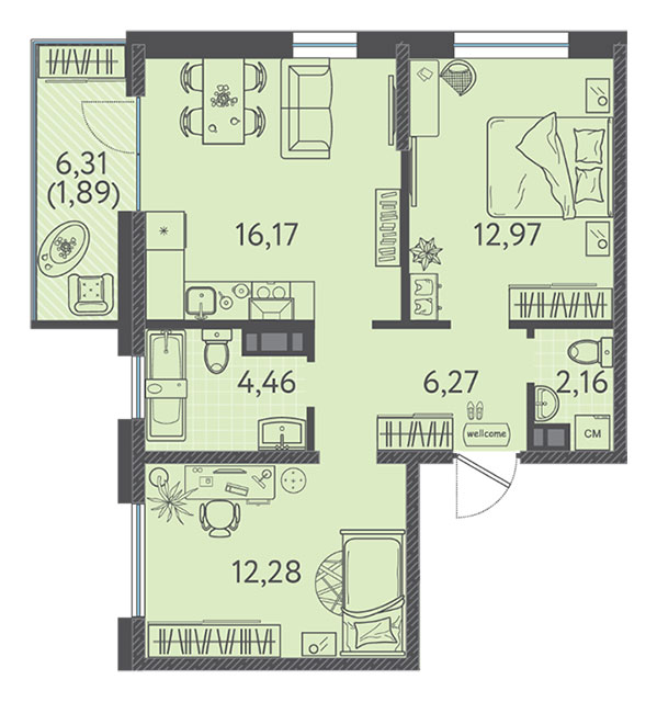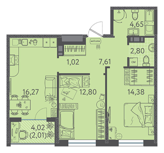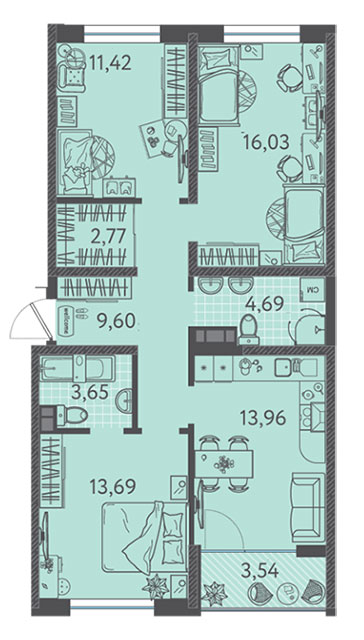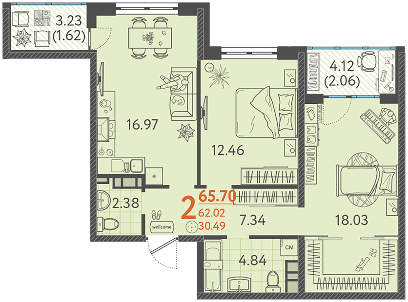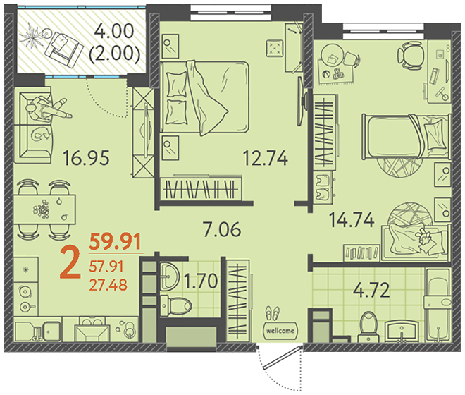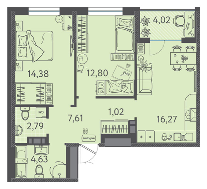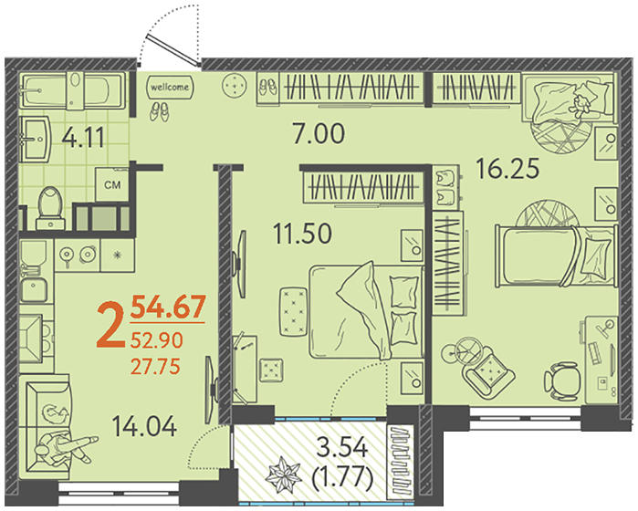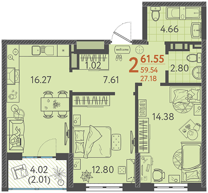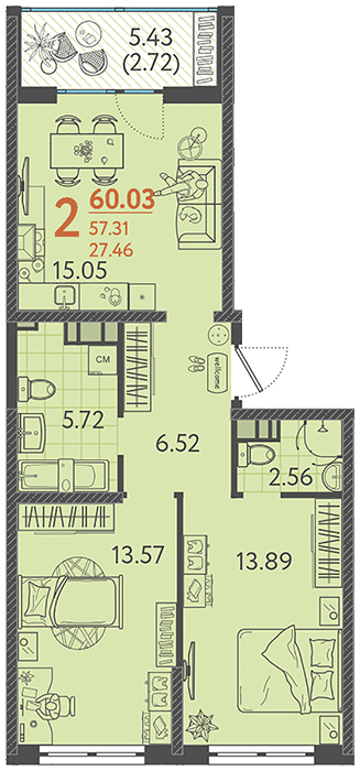 2 60.03 / 27.46 м² от 7 923 960 руб. (132 000 руб./м²) Планировка
