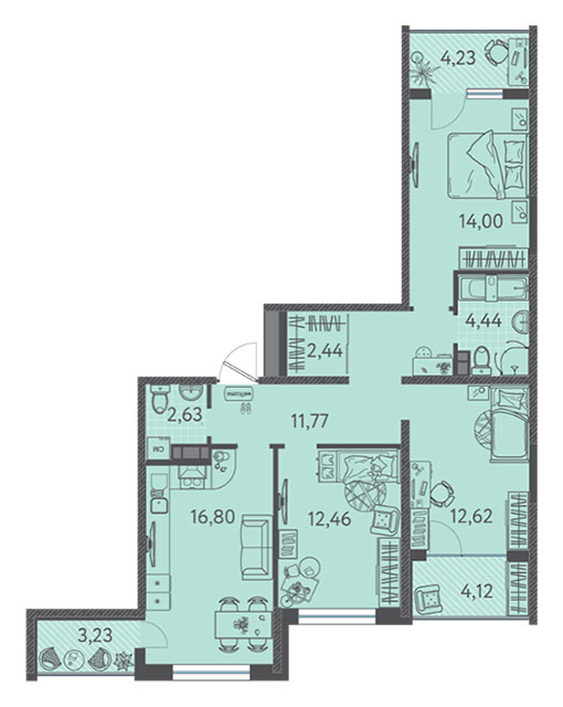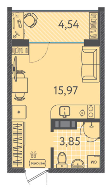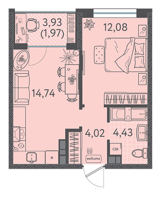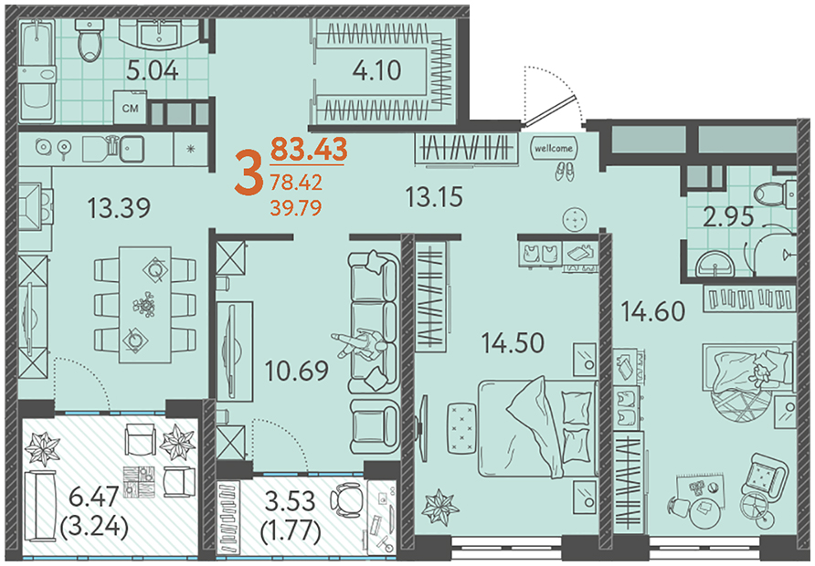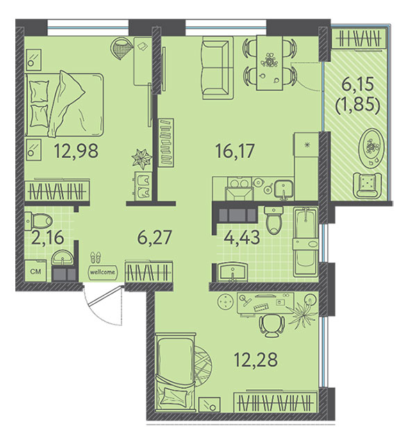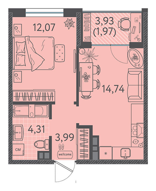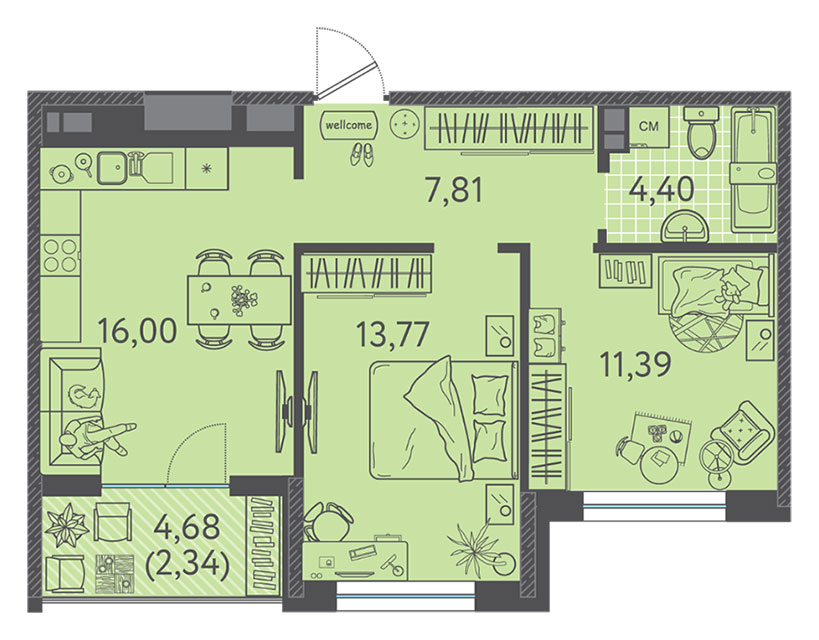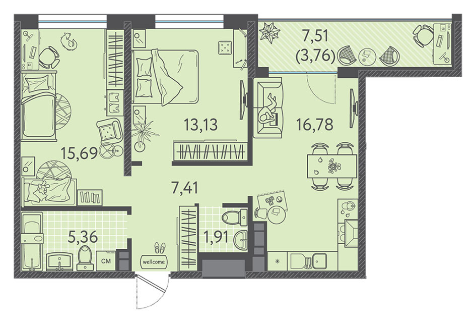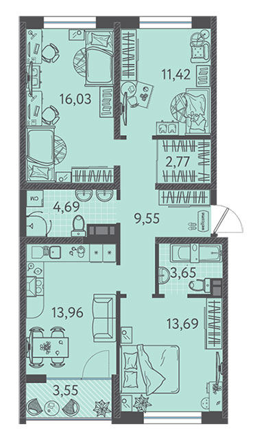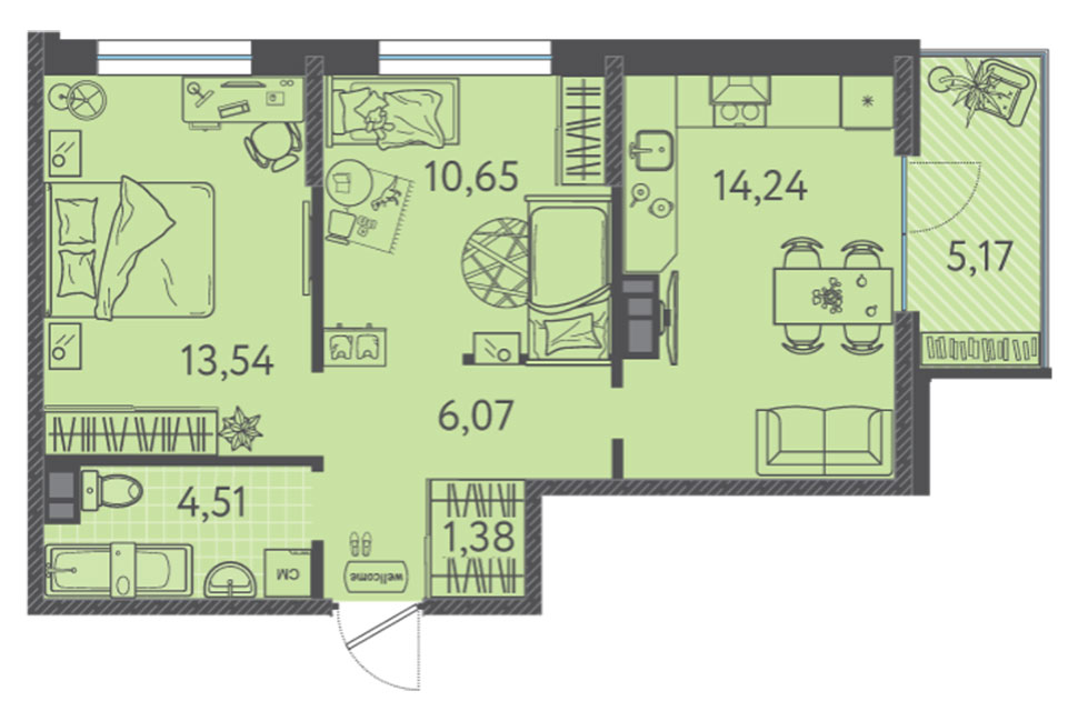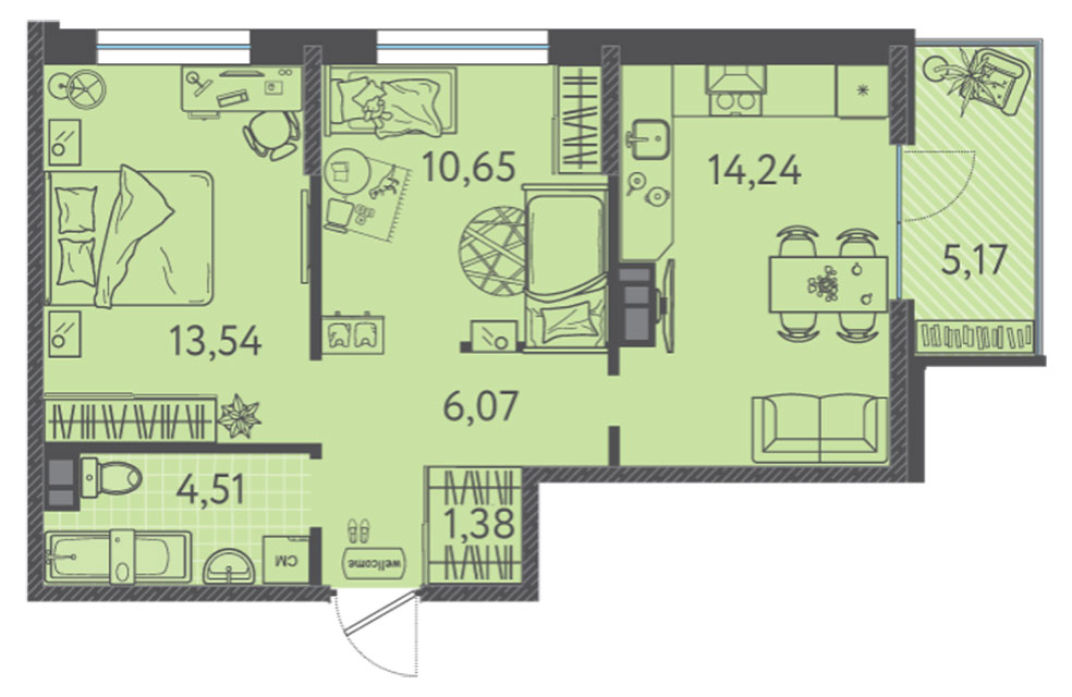 2 60.03 / 27.46 м² от 7 923 960 руб. (132 000 руб./м²) Планировка