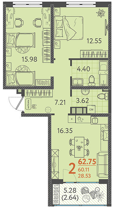 2 62.75 / 28.53 м² от 8 094 750 руб. (129 000 руб./м²) Планировка