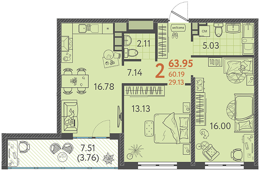 2 63.95 / 29.13 м² от 8 249 550 руб. (129 000 руб./м²) Планировка