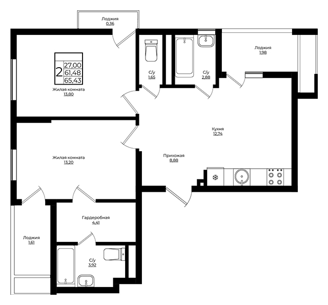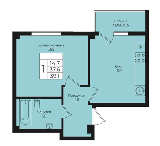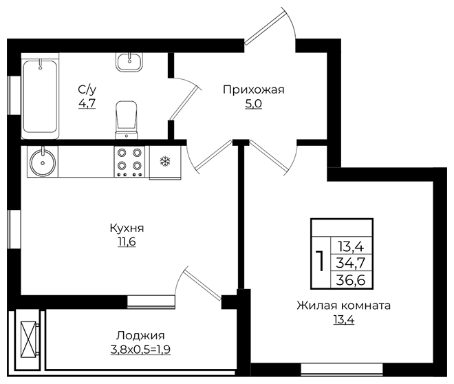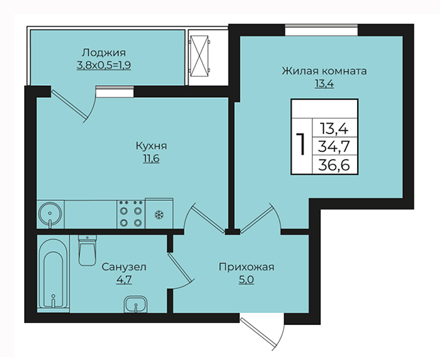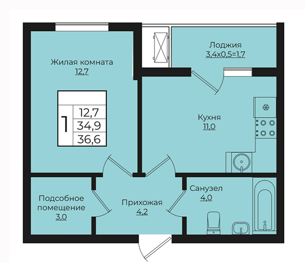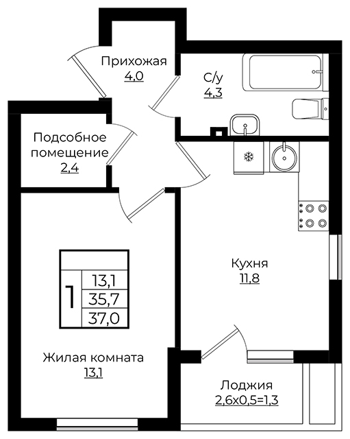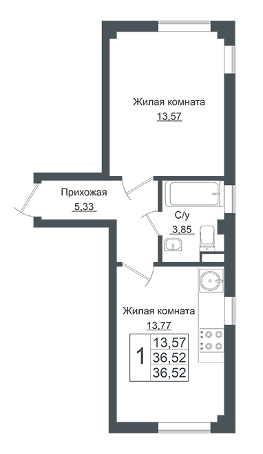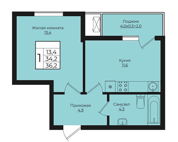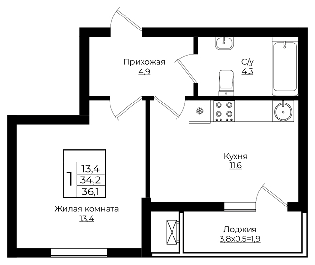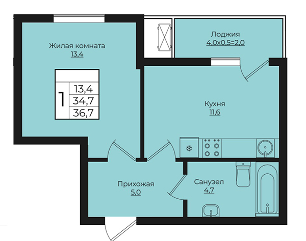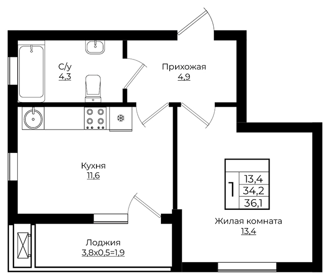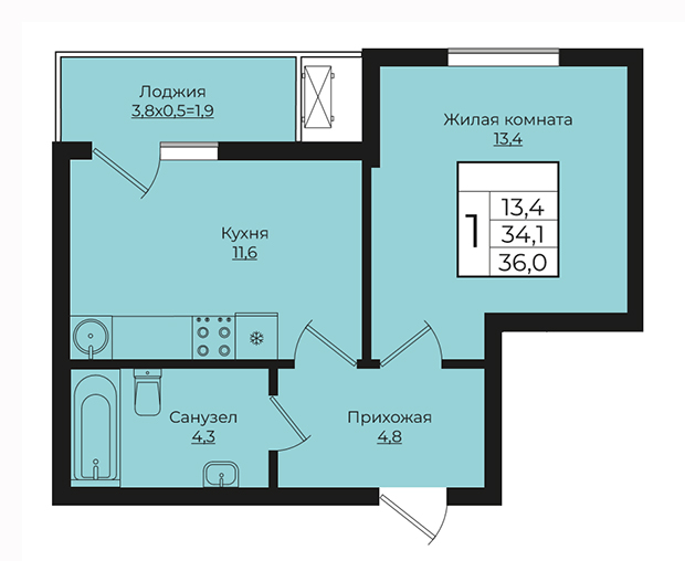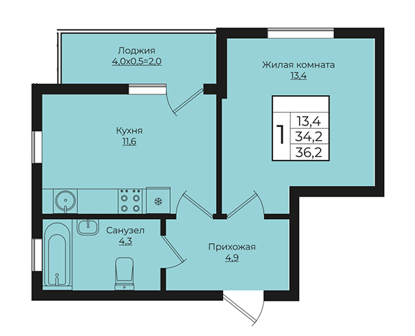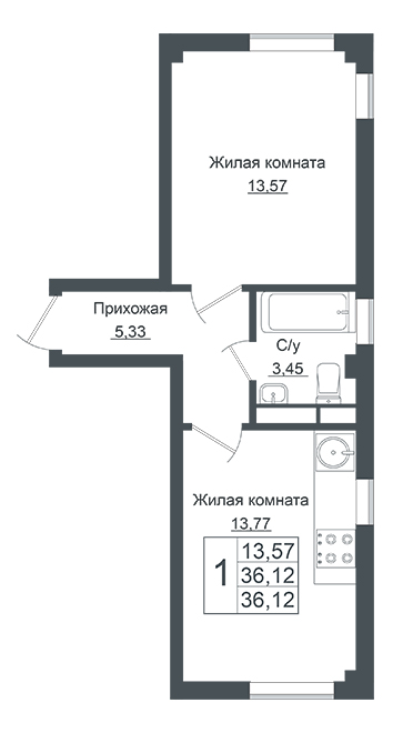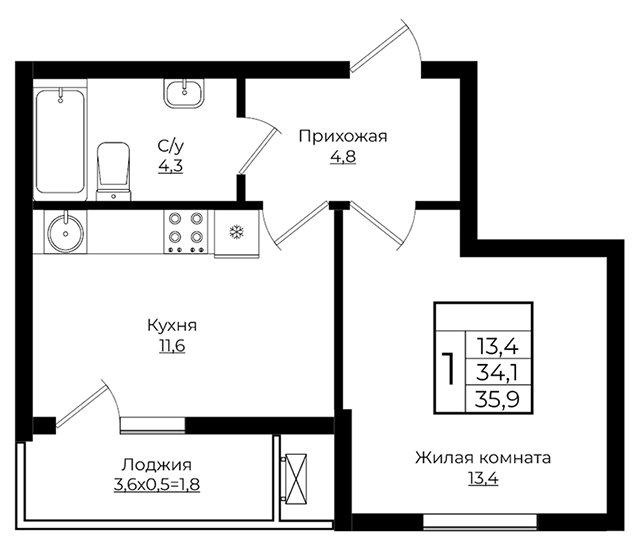 1 36.0 / 13.4 м² от 4 572 000 руб. (127 000 руб./м²) Планировка