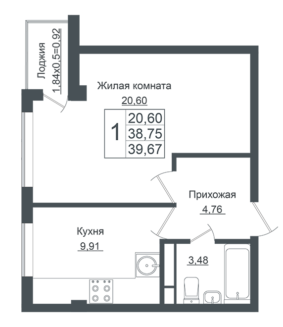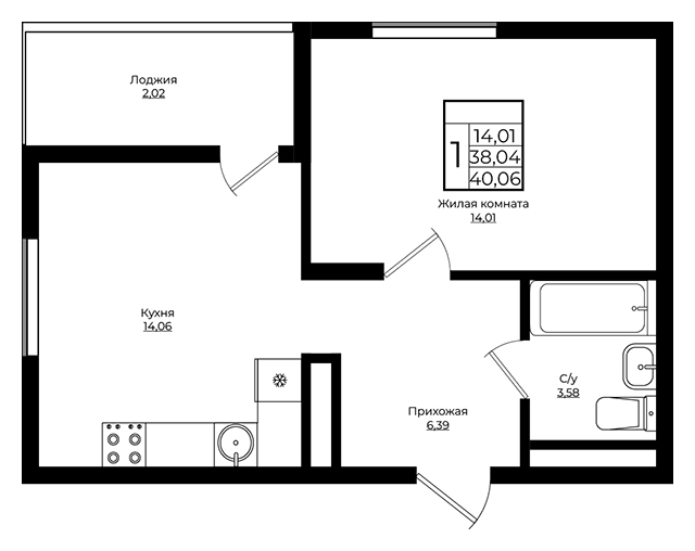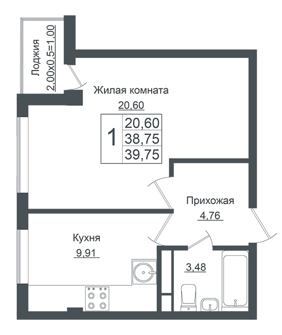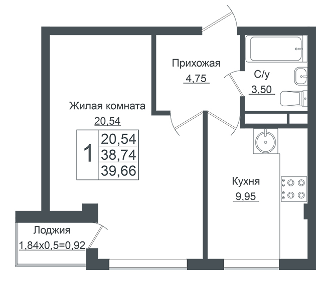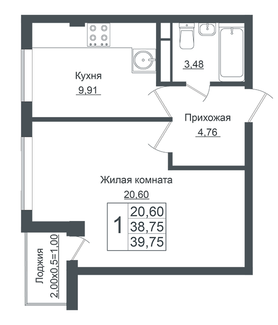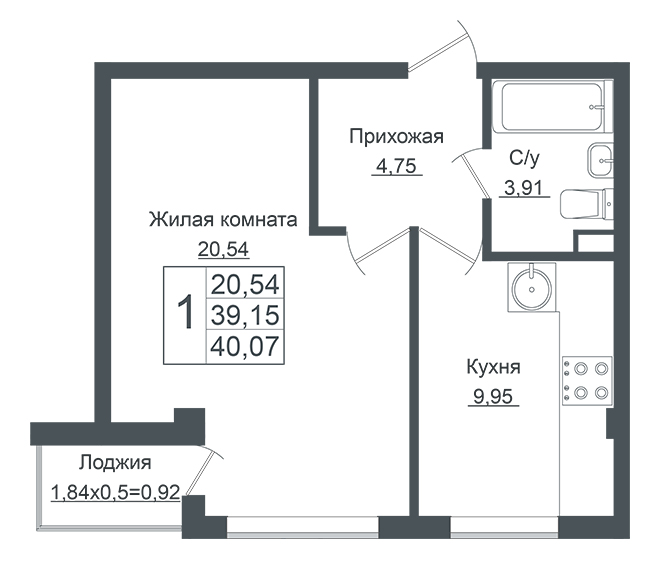 1 40.1 / 20.54 м² от 5 597 960 руб. (139 600 руб./м²) Планировка