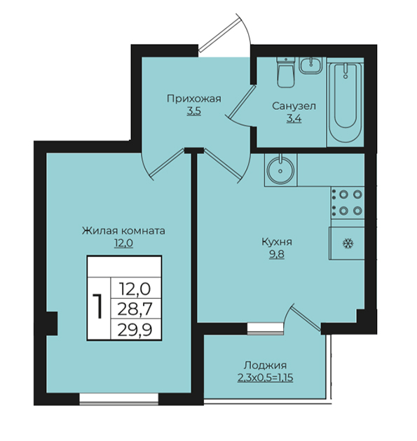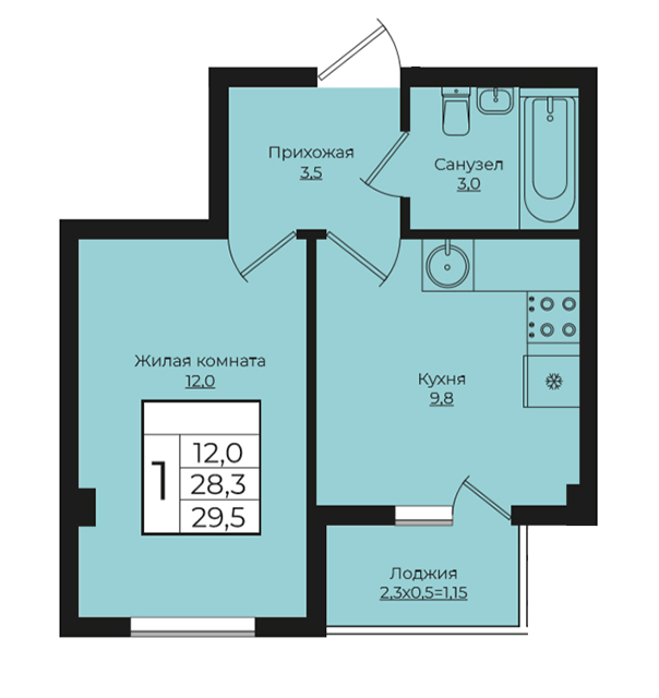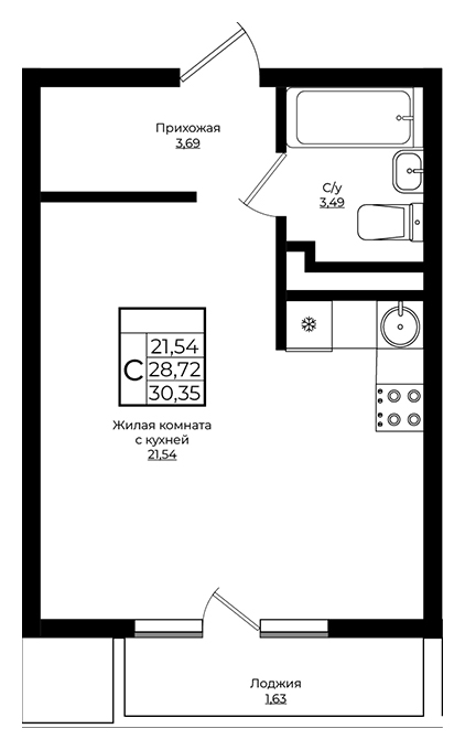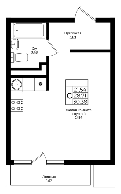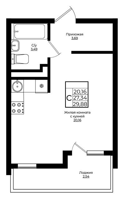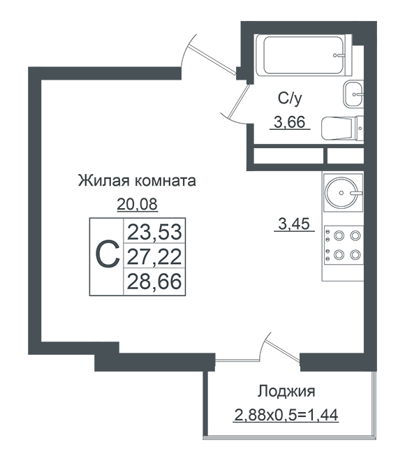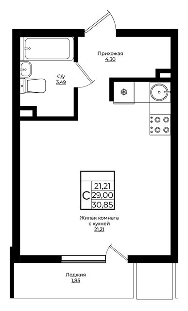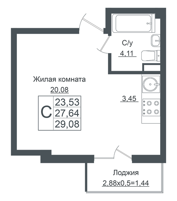 студия 29.08 / 23.53 м² от 4 501 584 руб. (154 800 руб./м²) Планировка