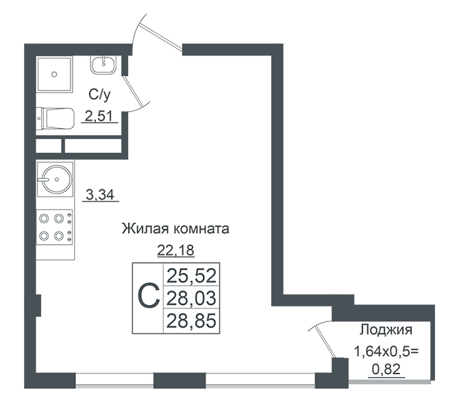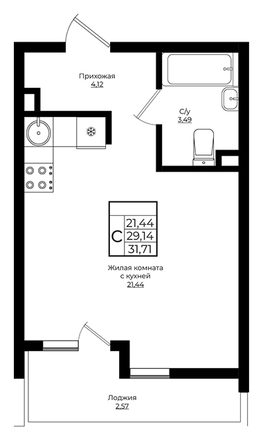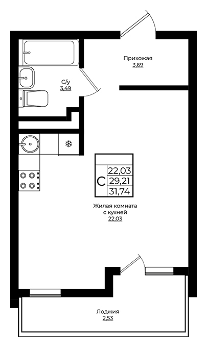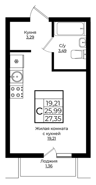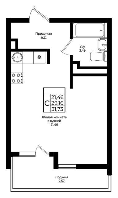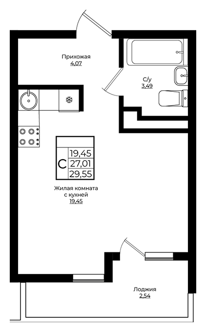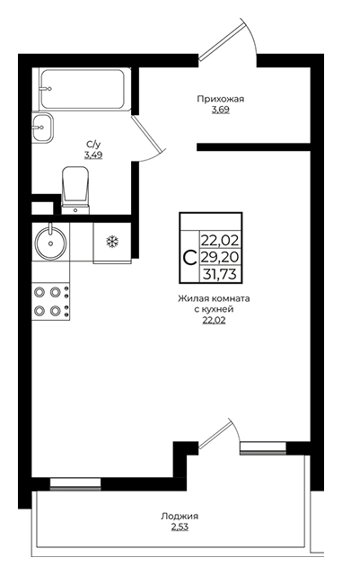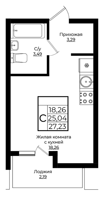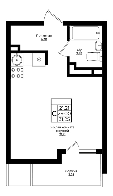 студия 29.24 / 25.52 м² от 4 464 948 руб. (152 700 руб./м²) Планировка