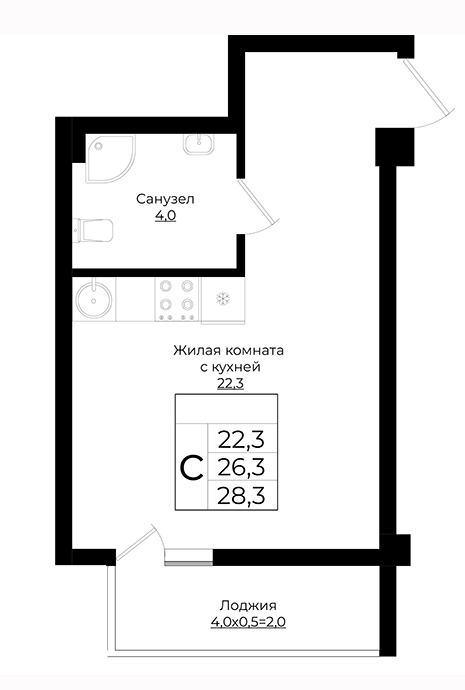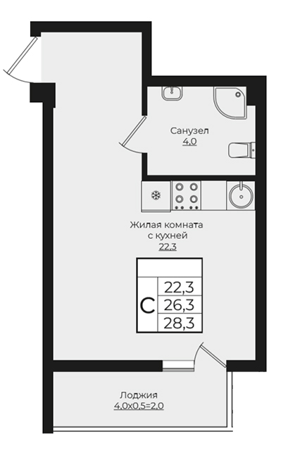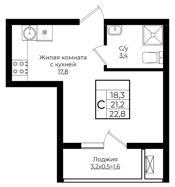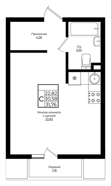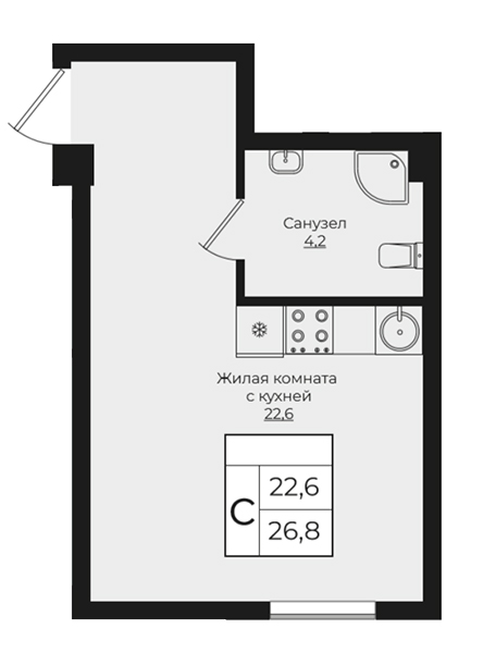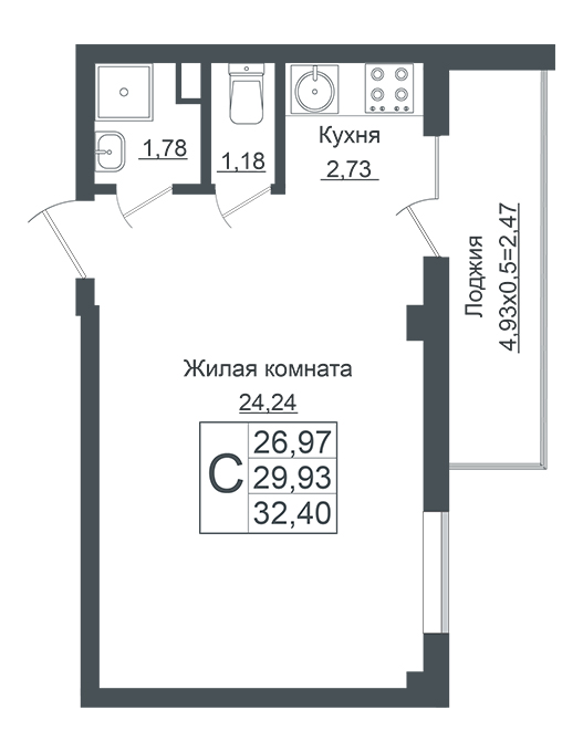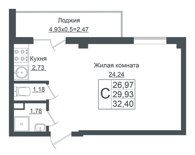 студия 32.4 / 26.97 м² от 4 983 120 руб. (153 800 руб./м²) Планировка