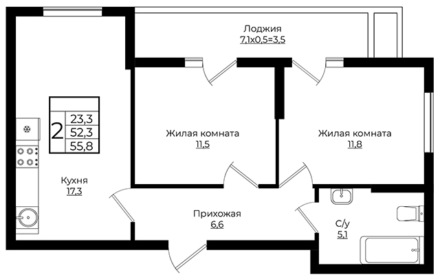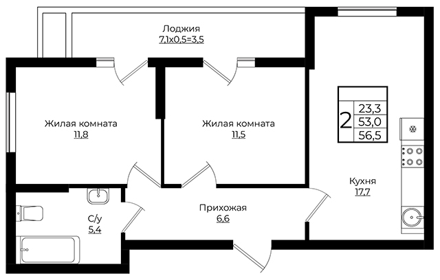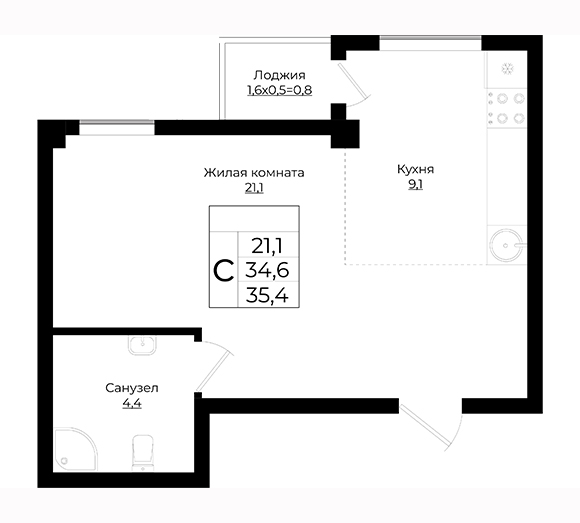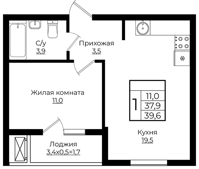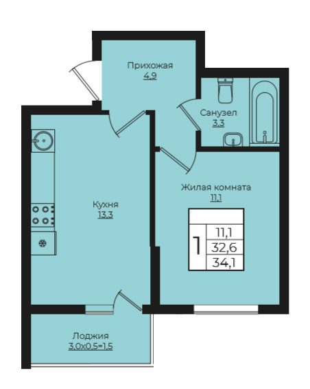 1 34.1 / 11.1 м² от 4 211 350 руб. (123 500 руб./м²) Планировка