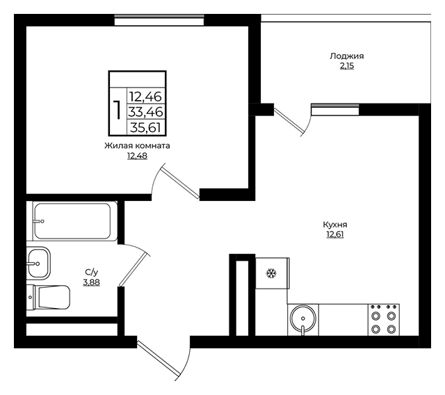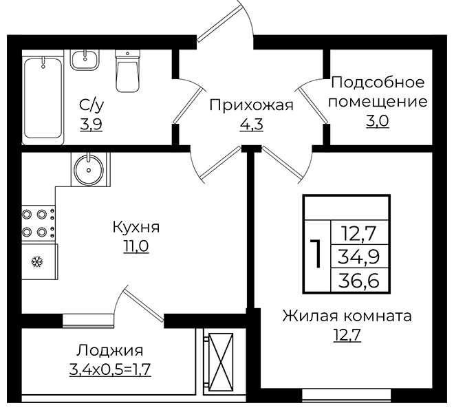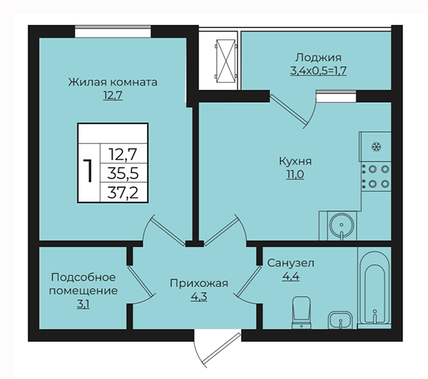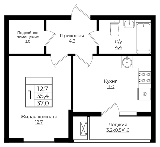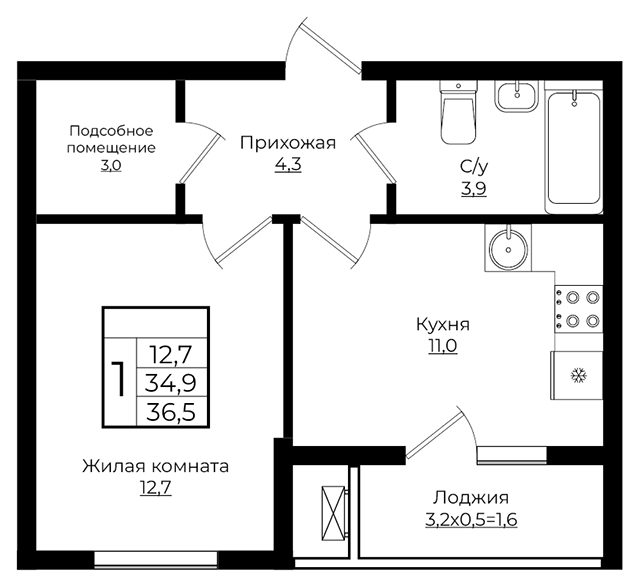 1 36.7 / 12.7 м² от 4 565 480 руб. (124 400 руб./м²) Планировка