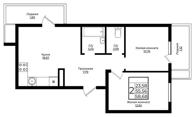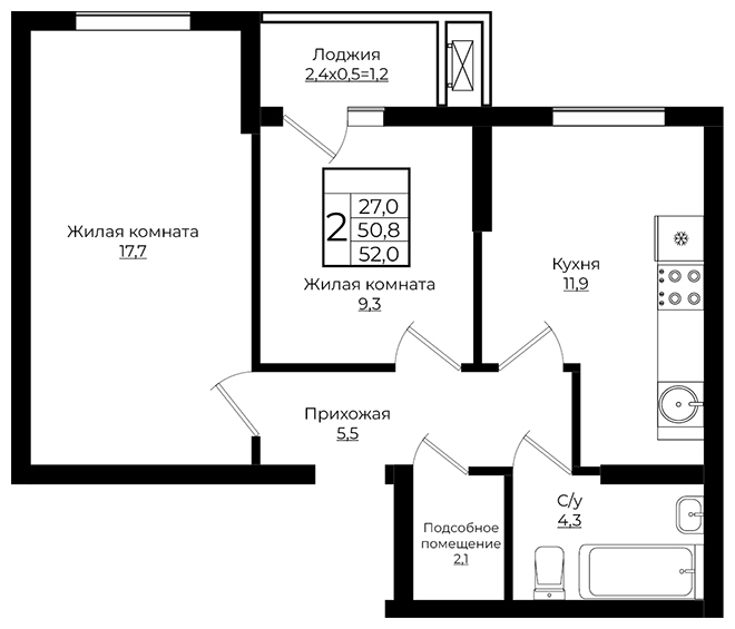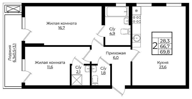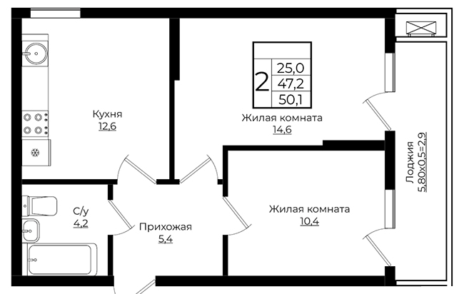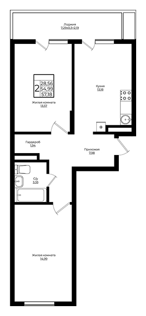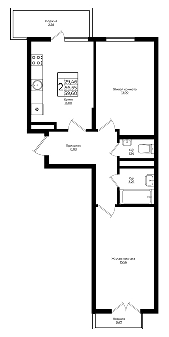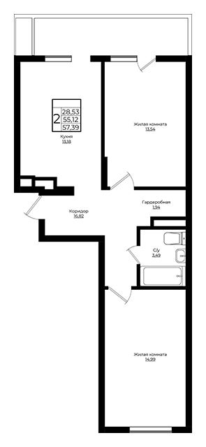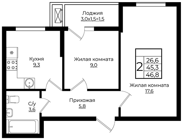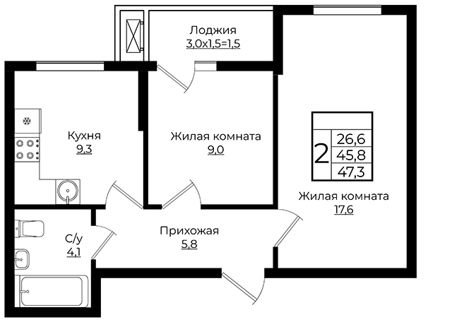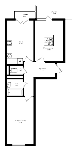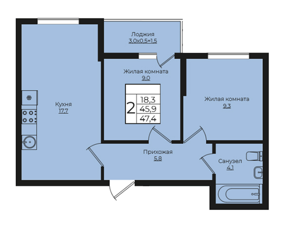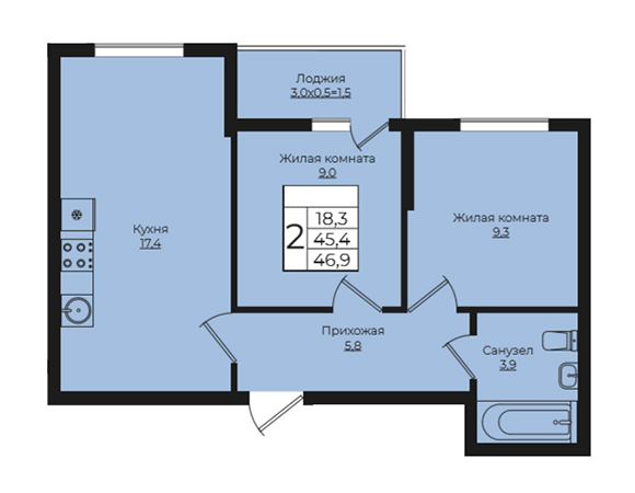 2 46.9 / 18.3 м² от 5 857 810 руб. (124 900 руб./м²) Планировка