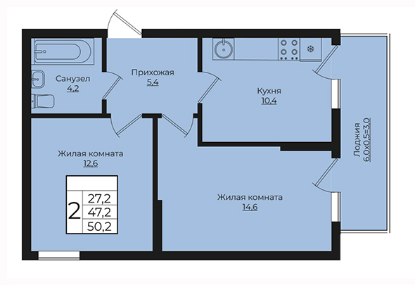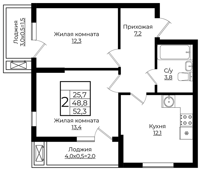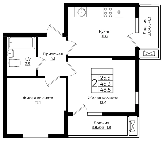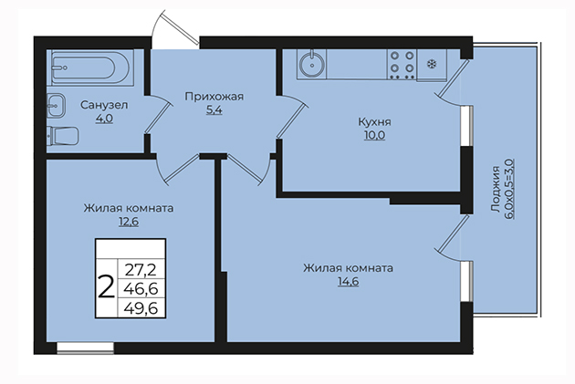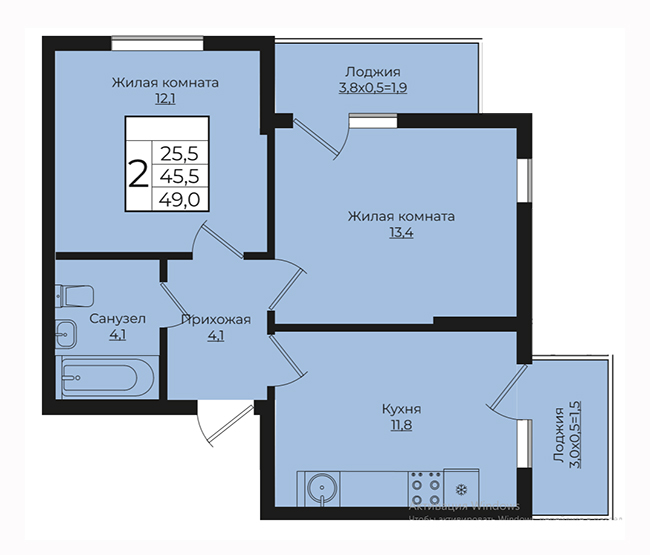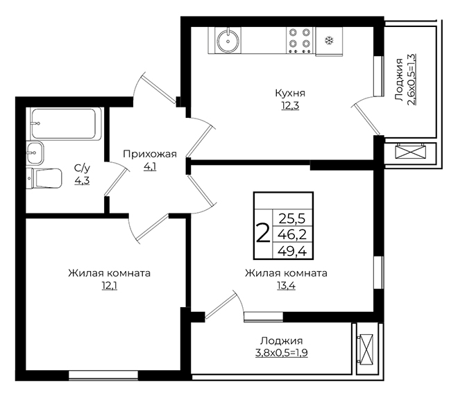 2 49.0 / 25.5 м² от 6 208 300 руб. (126 700 руб./м²) Планировка