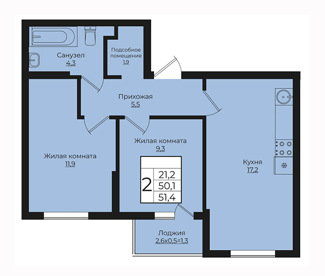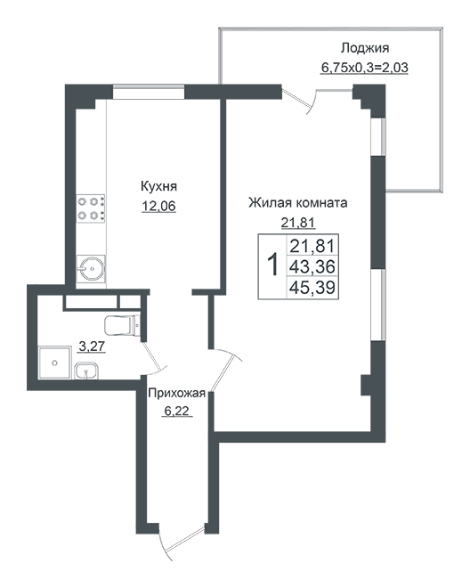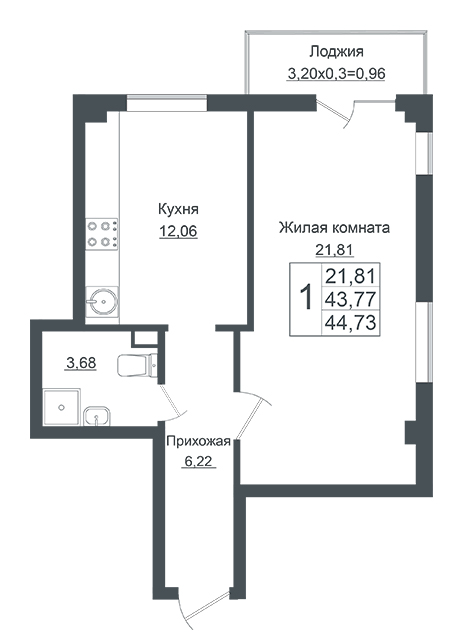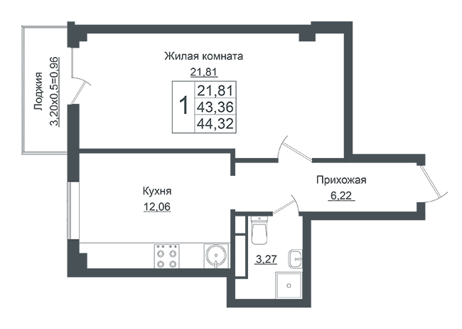 1 44.32 / 21.81 м² от 5 668 528 руб. (127 900 руб./м²) Планировка