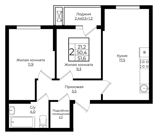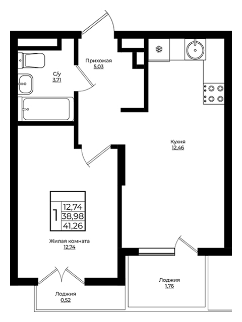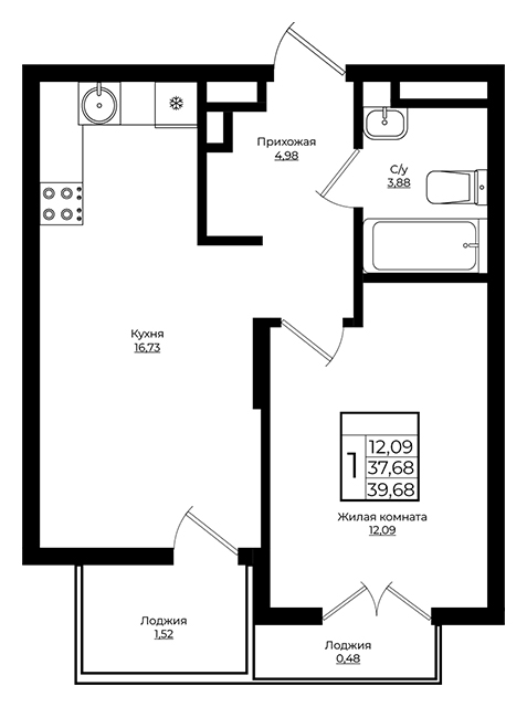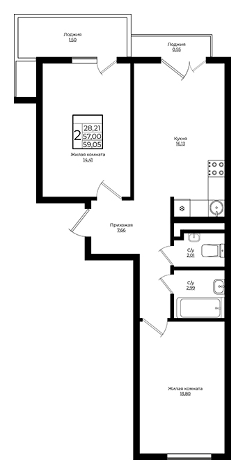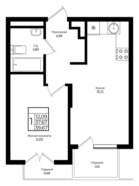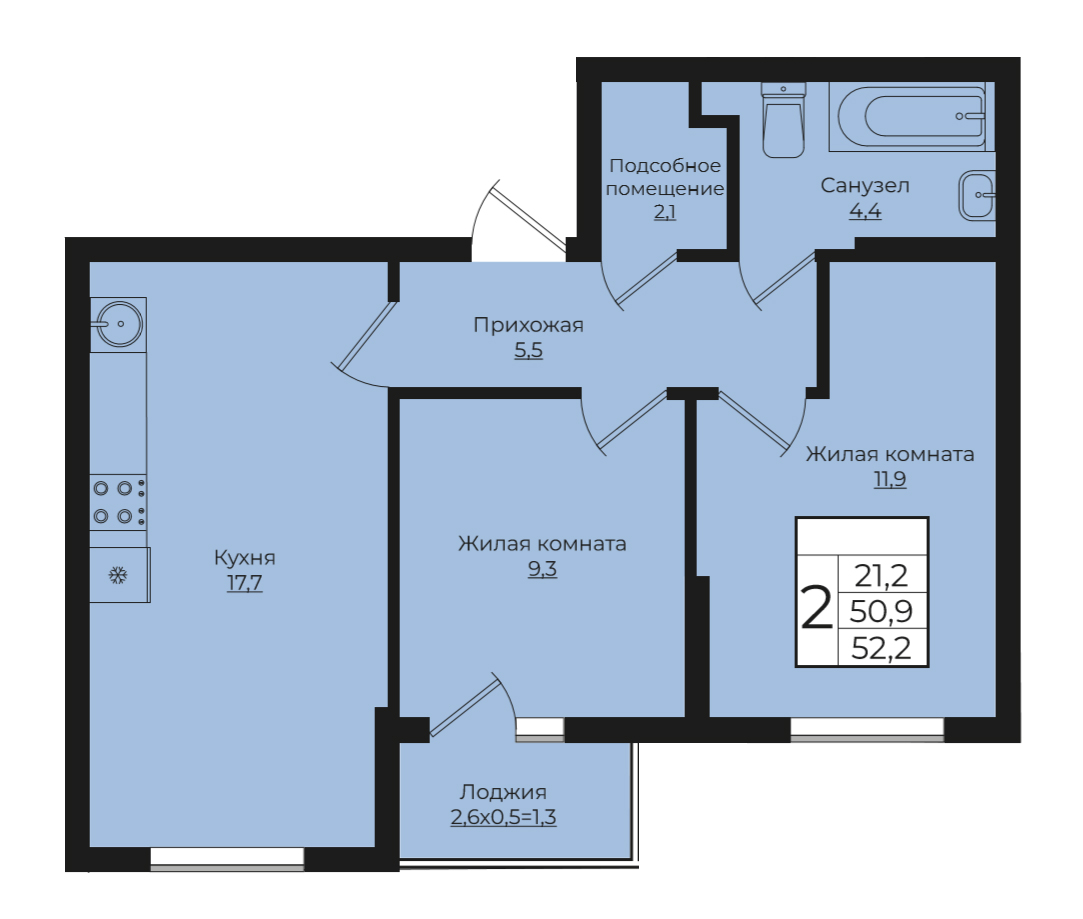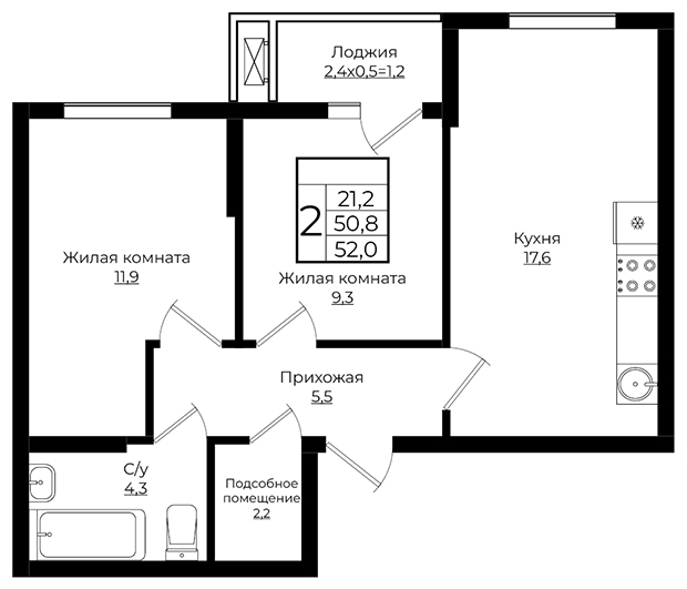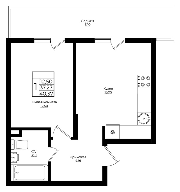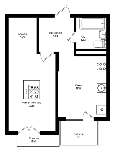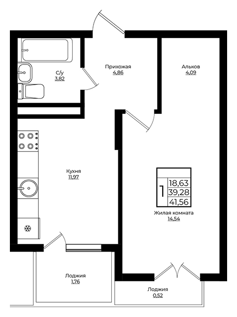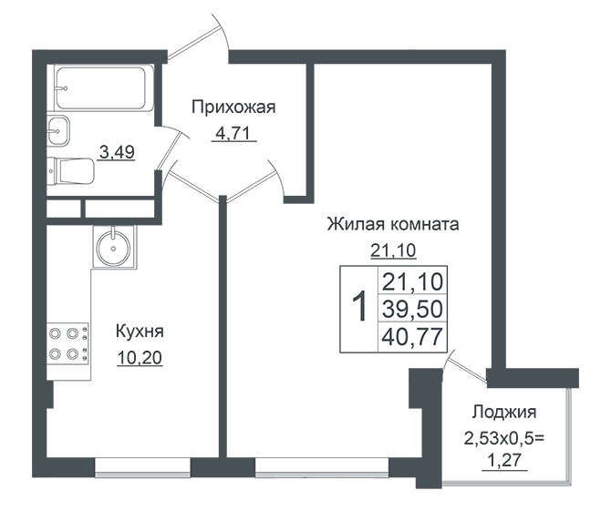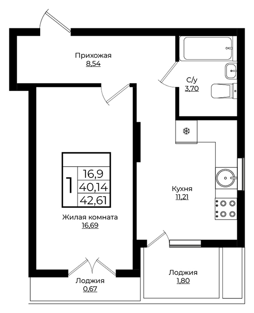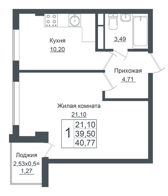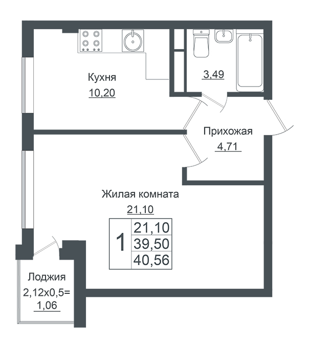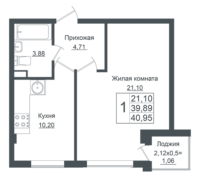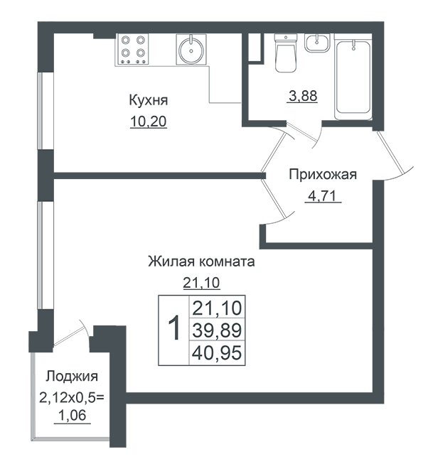 1 40.95 / 21.1 м² от 5 552 820 руб. (135 600 руб./м²) Планировка