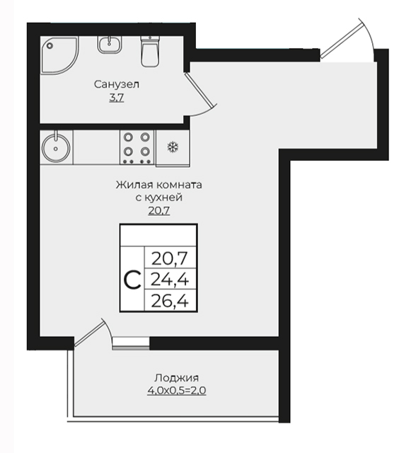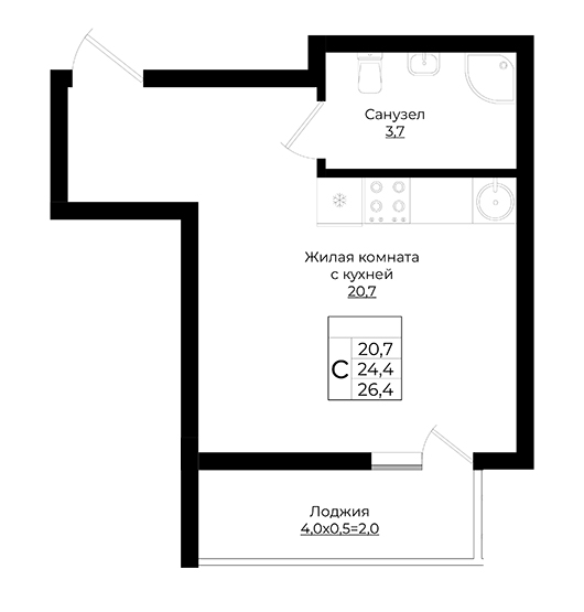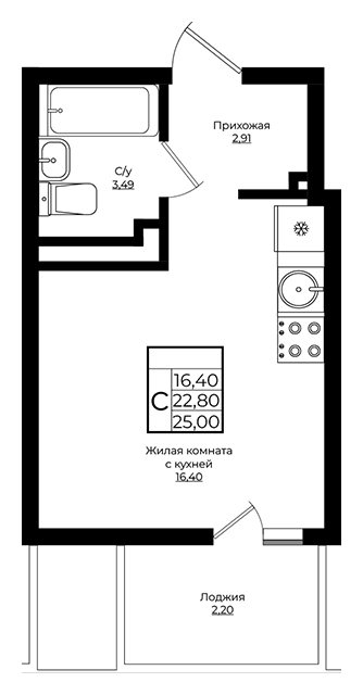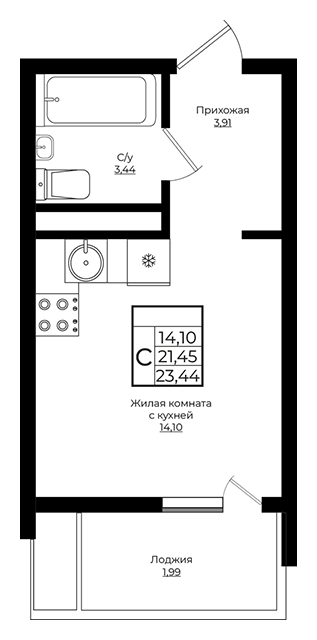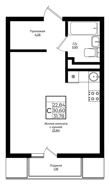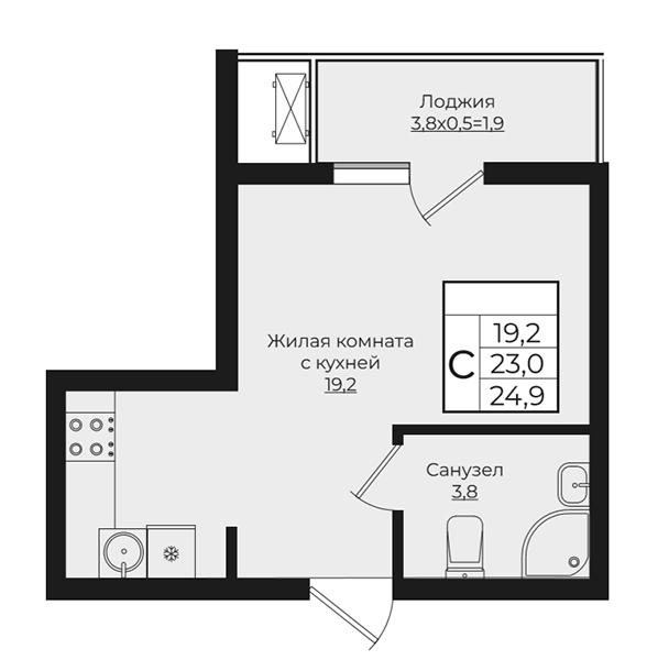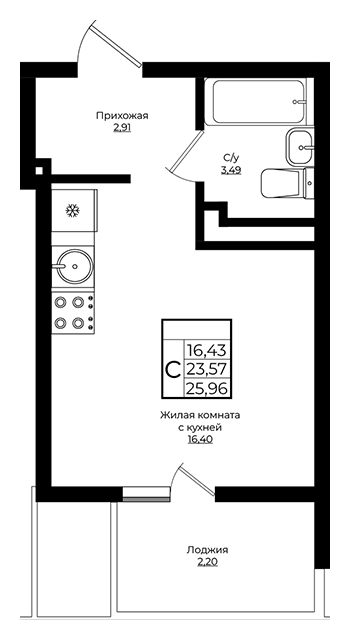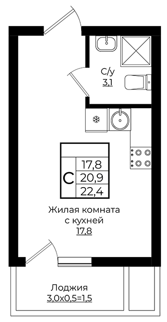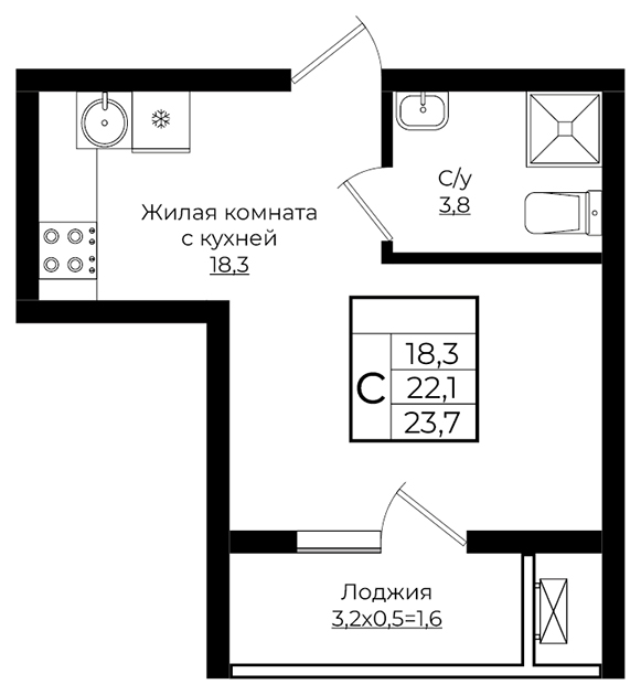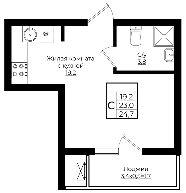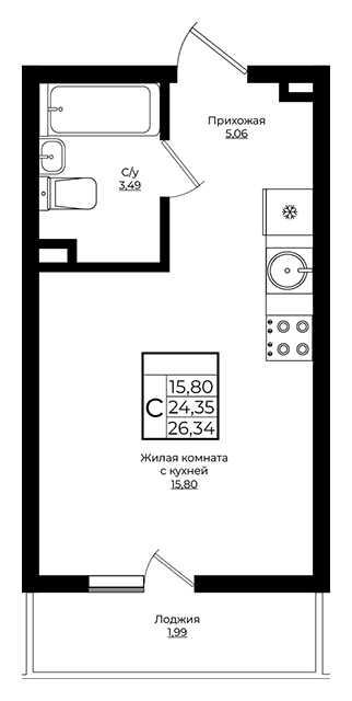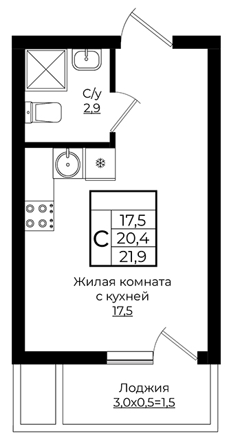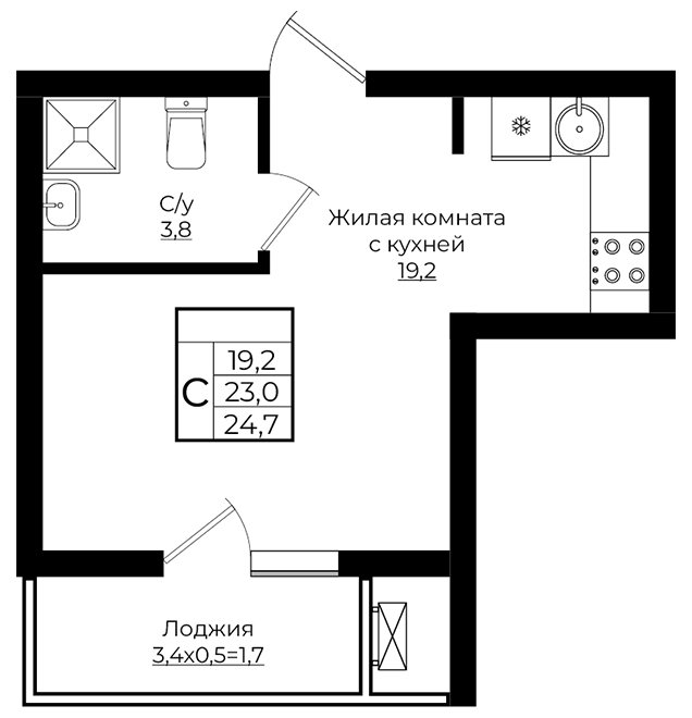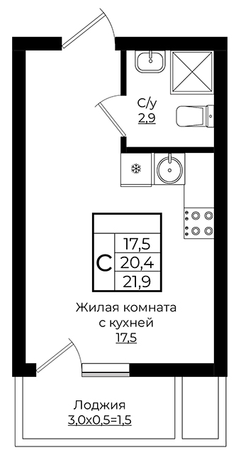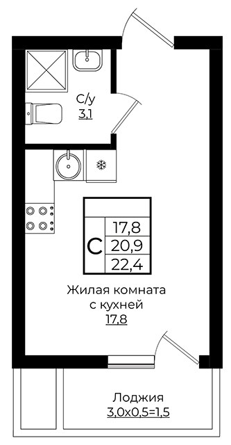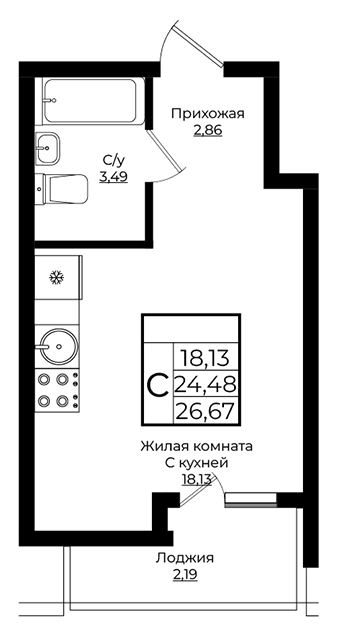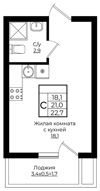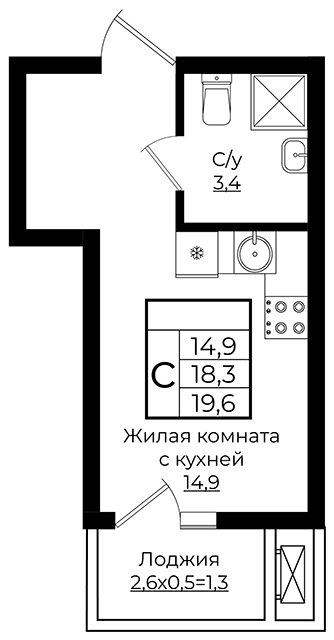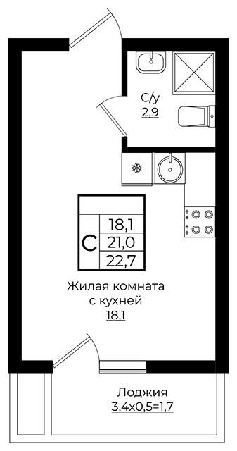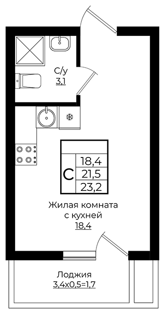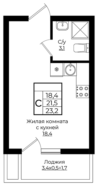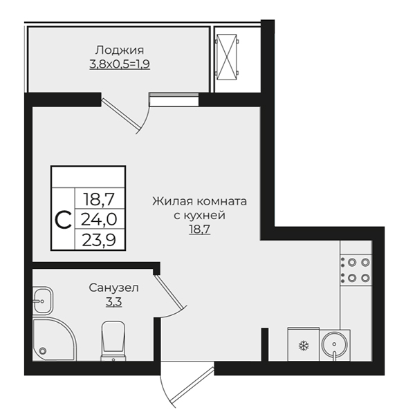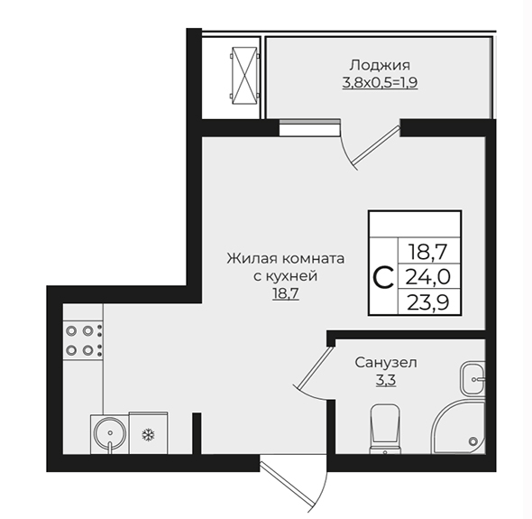 студия 23.9 / 18.7 м² от 3 534 810 руб. (147 900 руб./м²) Планировка