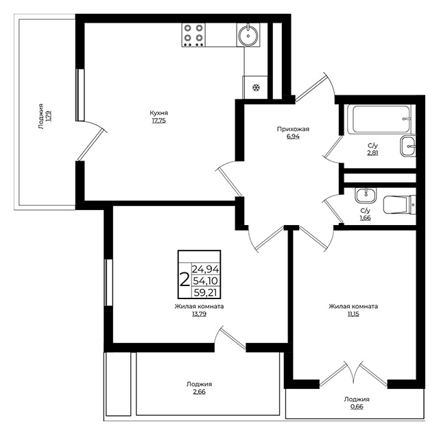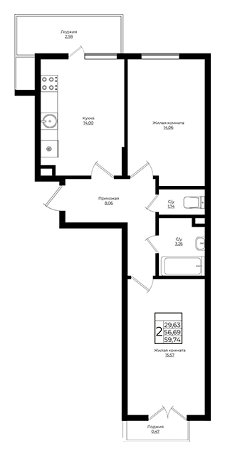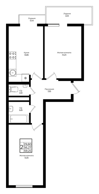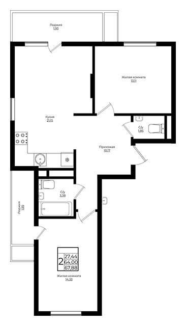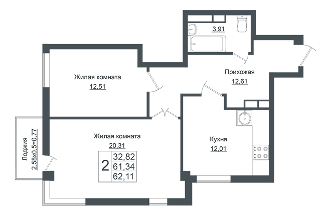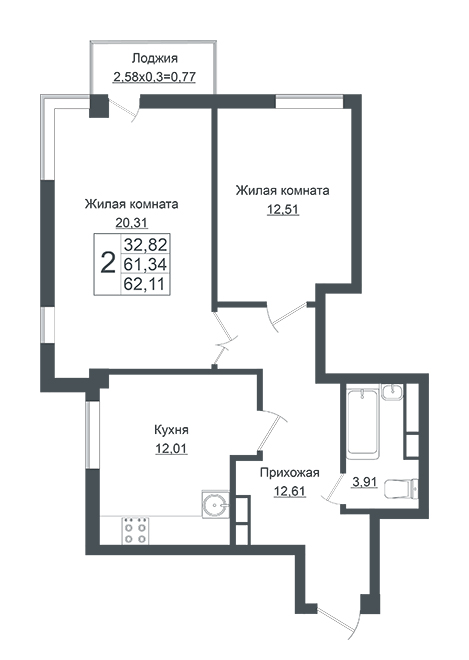 2 62.11 / 32.82 м² от 7 502 888 руб. (120 800 руб./м²) Планировка