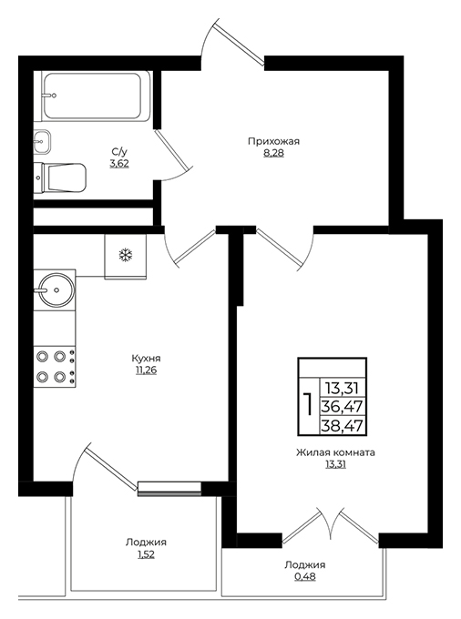 1 36.2 / 10.3 м² от 4 532 240 руб. (125 200 руб./м²) Планировка