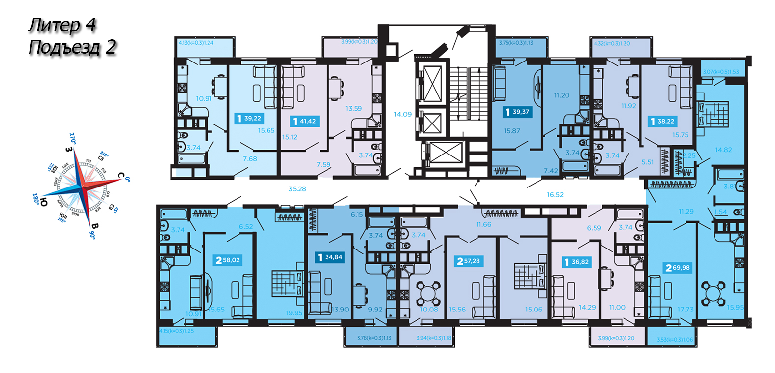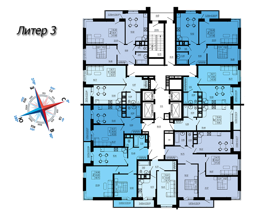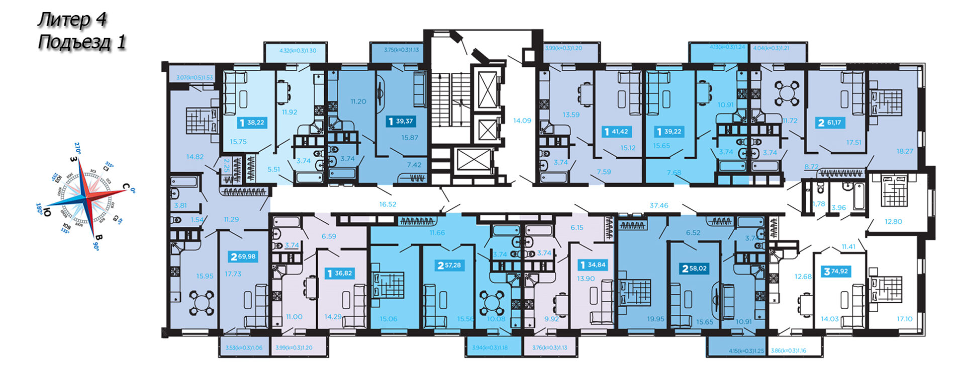 Планировочные решения ЖК “Галактика” представлены в виде студий, одно-, двух-, трехкомнатных квартир и европланировок (кухня соединена с гостиной).