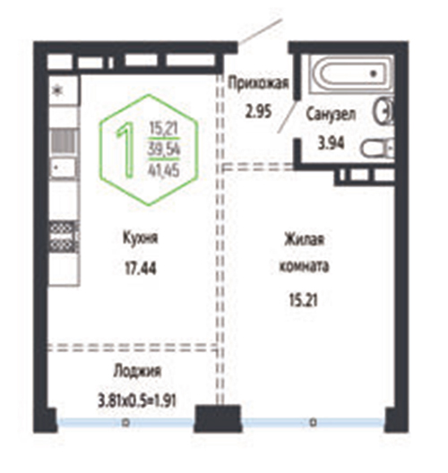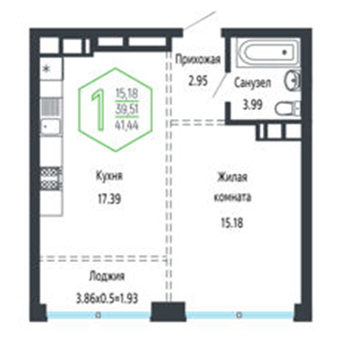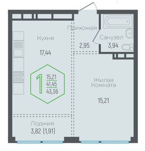 1 41.45 / 15.18 м² от 8 290 000 руб. (200 000 руб./м²) Планировка